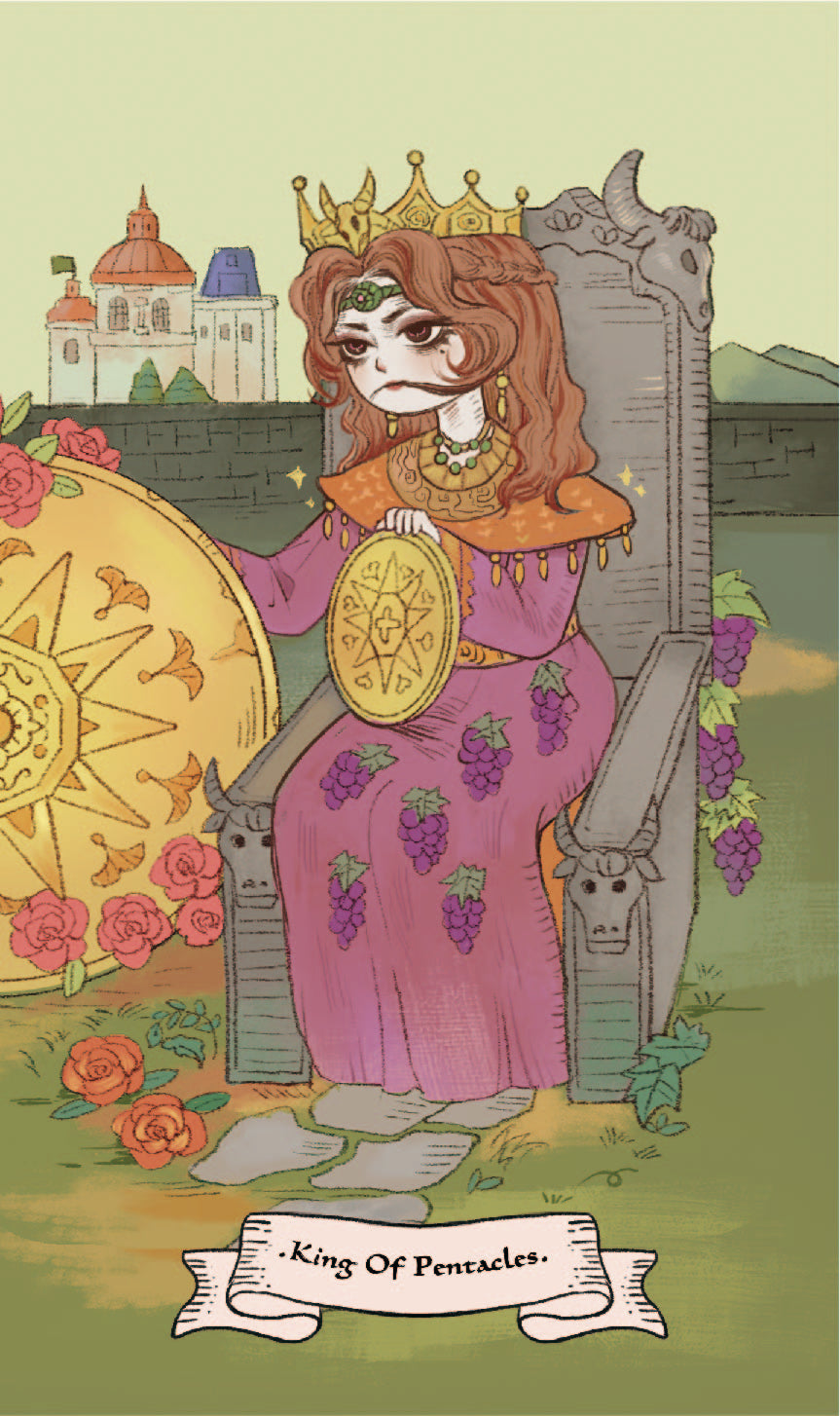 The King of Pentacles sits with composed authority, his gaze calm yet resolute — ever prepared for new challenges. He embodies the essence of the earth element: stability, patience, and tangible success. This king has built his wealth through steady work and wise management; his prosperity is hard-earned, not granted by chance. Though surrounded by abundance, he values balance and responsibility over excess. Representing a reliable, grounded, and disciplined individual, this card encourages practical thinking, measured ambition, and faith in the slow, deliberate process that turns effort into enduring success.