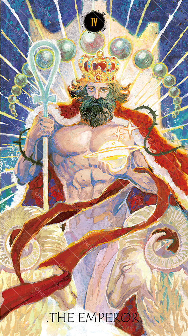 The Emperor symbolizes power and experience. He possesses the ability to understand the profound truths of the universe. His strong and solid physique reflects masculine strength and unwavering will. With extraordinary charisma, he attracts and harnesses resources—each as precious and potent as raw gems. The neatly arranged arches symbolize his excellent organizational and management skills. The thorns that once bound him have now fallen away, representing his liberation from past constraints, leaving him more mature and powerful than before.