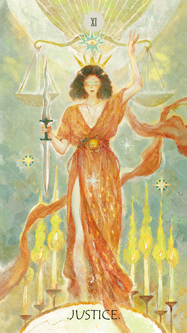The Justice card symbolizes fairness, balance, and truth. The red-robed goddess Themis stands tall, her left hand raised, signifying her authority and resolve.In her right hand, she holds a double-edged sword—one side curved like a snake, representing wisdom and spirituality; the other straight, symbolizing reality and decision-making. This indicates that judgment requires the integration of both spiritual insight and practical reasoning.