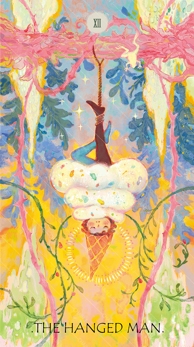 The little sprite is trapped by creamy candy, possibly symbolizing temptation by material pleasures or being bound by past experiences. This may represent a current situation of entrapment or self-imposed limitations. The light radiating from his head reflects inner strength and hope, showing he is ready to face reality and can find balance between joy and responsibility.