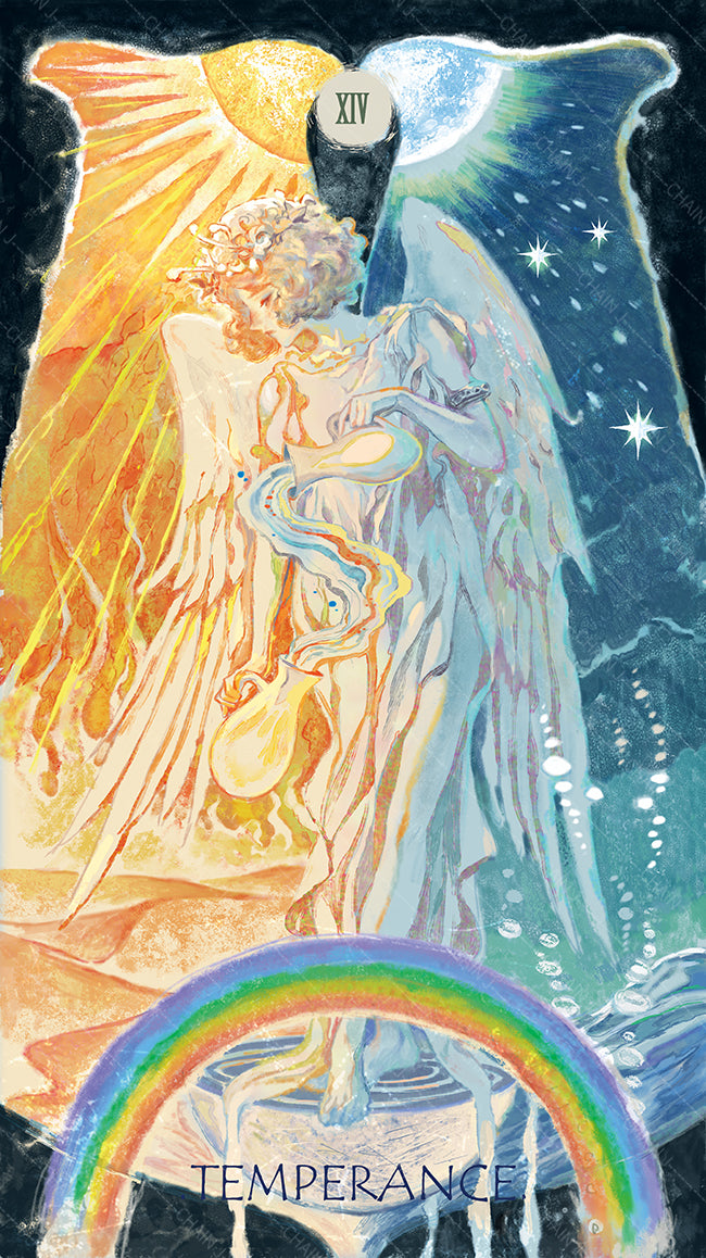 The Temperance card symbolizes a symphony of balance and harmony. Archangel Michael stands at the meeting point of sun and moon, day and night—a sacred realm where time and space intertwine.