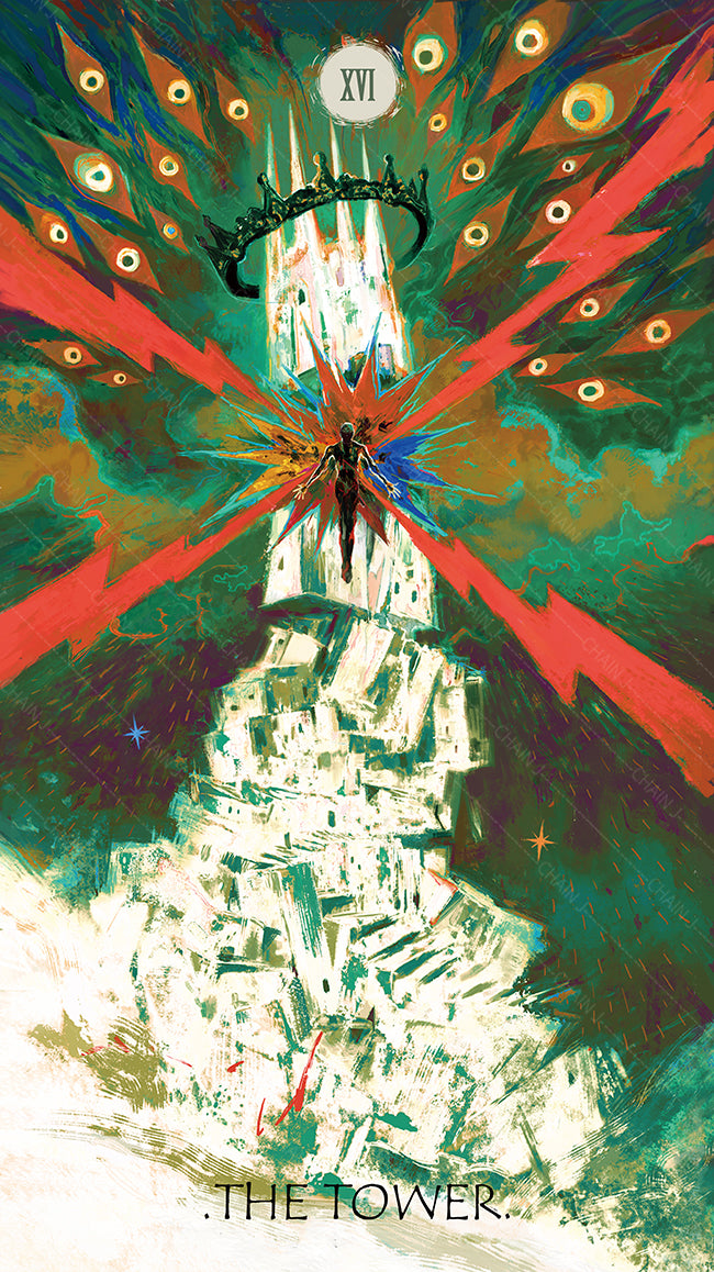 The black crown symbolizes our desire for control—either over things or over others. When the tower begins to collapse and the crown falls with it, it signifies the loss of control and power. The many divine eyes in the sky reflect the wrath and judgment of higher forces, or the pressure exerted by the outside world.