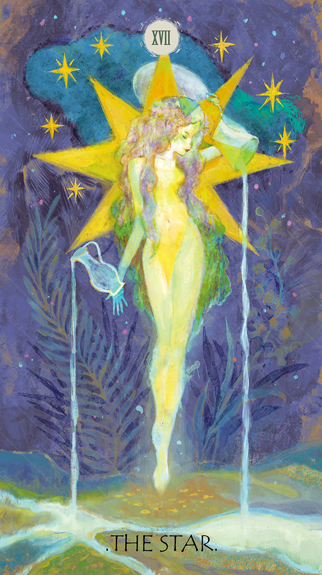 The Star card represents hope, inspiration, optimism, and vision. The star takes the form of a graceful, long-haired maiden radiating a soft glow that symbolizes her inner wisdom and innocence. Even when the outside world is cloaked in darkness, her light shines forth, guiding the way with promise and renewal.