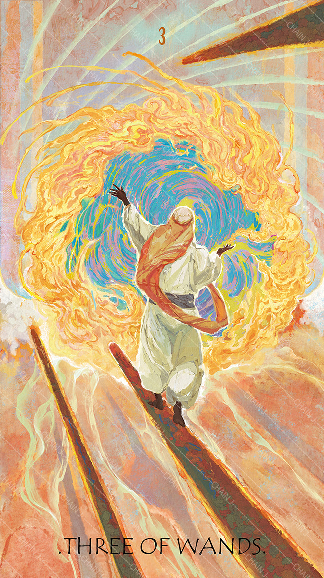 The Three of Wands embodies foresight, leadership, and exploration. In life’s journey, once we’ve built a foundation and cultivated ability, we are ready for breakthrough moments and growth. Whether in career advancement, romantic pursuits, or personal development, this card encourages us to stay optimistic and courageous, boldly stepping into new stages and expanding our territory.