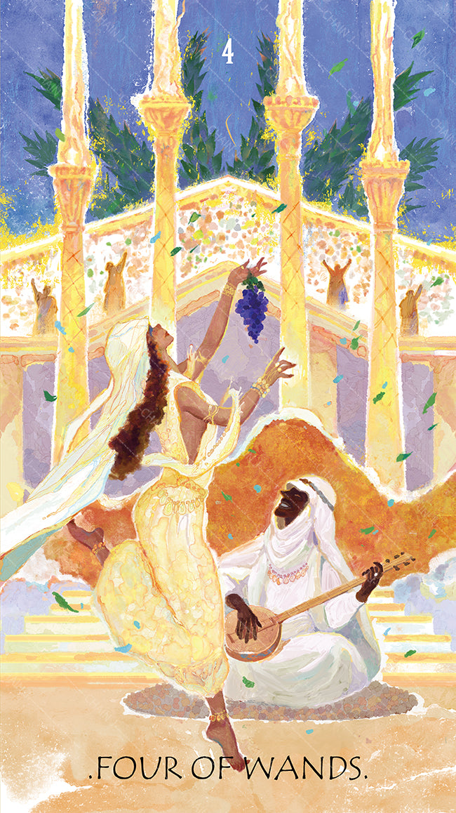 This moment radiates the core essence of the Four of Wands: stability, harmony, and celebration. It invites us to embrace joy and appreciate the brilliance of life. This card may suggest settling into a new home or environment, enjoying a secure and abundant life. It could also indicate stability in career or love, and joyful success in social spheres. Now is a time of fulfillment—your past efforts have created a strong foundation. Allow yourself to relax and enjoy the fruits of your success.
