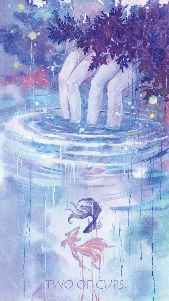 A serene pool shrouded in mist sets the scene for this intimate card. Fireflies sparkle like stars, creating a profoundly romantic atmosphere. Two pale white figures sit side by side with their feet dipped into the cool water, joyfully stirring up shimmering splashes. Beneath the surface, two golden fish spiral gracefully around each other, their movements mirroring the close and harmonious bond between the two individuals.
