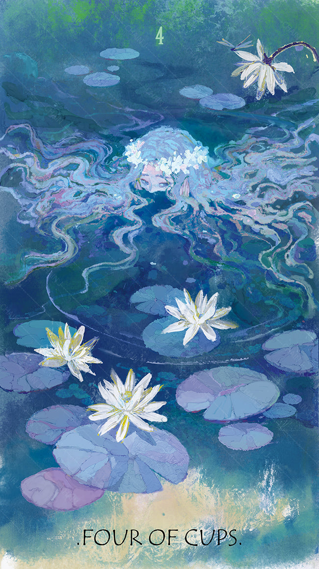The Four of Cups symbolizes dissatisfaction with the current situation, hesitation toward new opportunities, and a deep sense of resistance. In this quiet and solitary mood, the girl appears to be caught in self-doubt—uncertain about the unknown and unwilling to embrace potential beauty or hope. It reflects a time of emotional withdrawal and reluctance to engage with what's being offered.