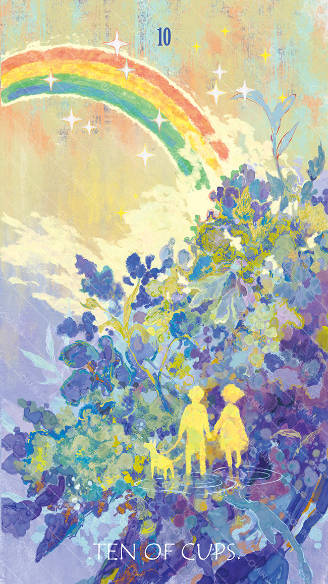 After a long emotional journey filled with highs and lows throughout the Suit of Cups, the Ten of Cups presents an image of near-perfect emotional fulfillment—a symbol of ultimate harmony and contentment. It represents the deep warmth of family, where members love and support one another; the sweetness and romance of love, where partners are in sync and walk hand in hand; and the sincerity of friendship, where friends are open-hearted and stand by each other through thick and thin.