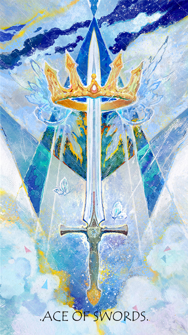 The Ace of Swords symbolizes new ideas and fresh beginnings—much like the moment I began designing this tarot deck. Initially, it was a simple and pure idea, lacking in strong momentum, unfolding leisurely with my mood. But as my thoughts broadened, just like the sharp blade of the Ace of Swords cutting through the fog, it evolved into a challenging project. It brought both the pressure of persistence and a deep sense of achievement. Holding the sword and moving forward—I had to do it well to leave no regrets.