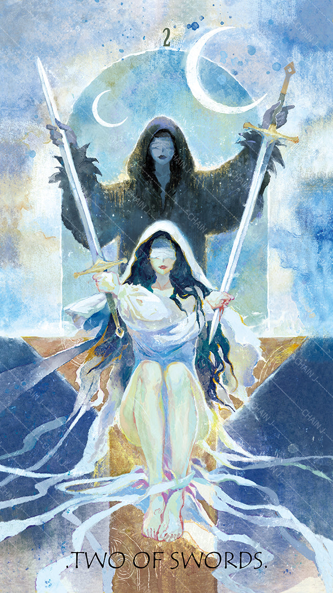 The figures dressed in black and white symbolize the clash between light and darkness. Each grips the hilt of their sword while simultaneously clutching the blade of the other's, representing inner contradiction and conflict. This deadlock reflects the struggle and hesitation one experiences when faced with a difficult choice.