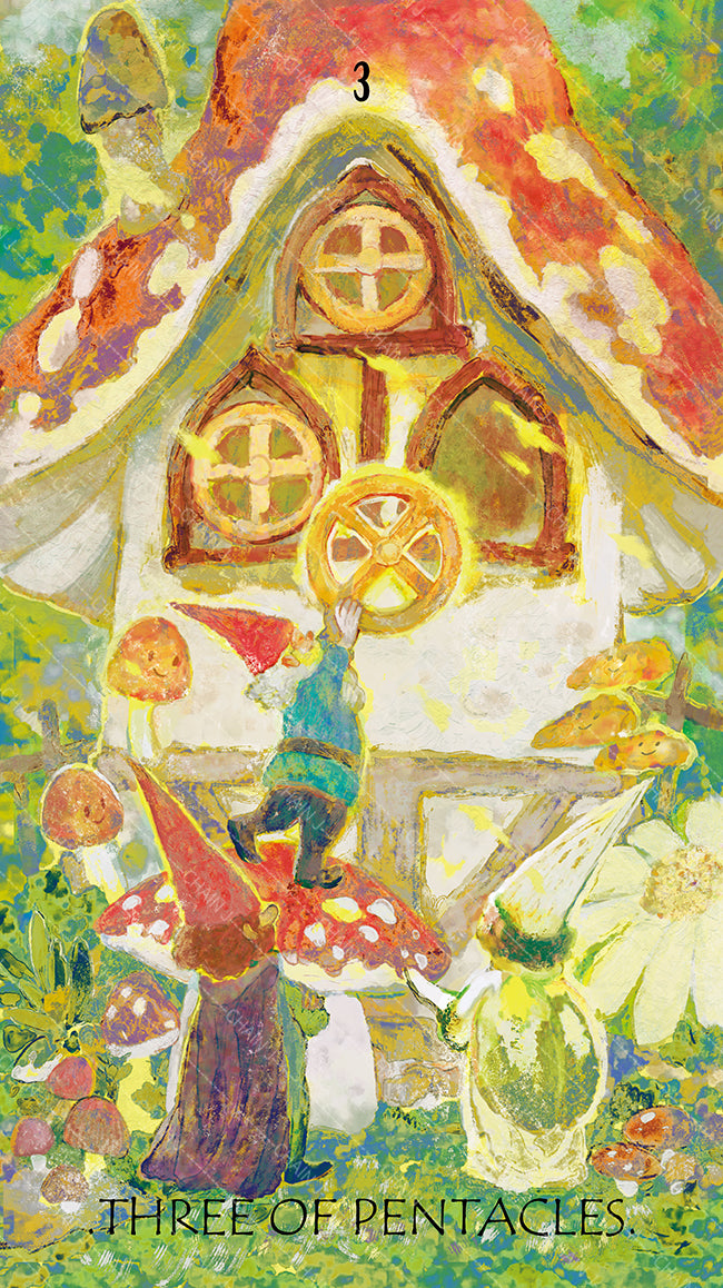 Deep in the forest, in front of a newly built mushroom house, a group of pixies are busily working together, each fulfilling their unique role. Their seamless cooperation illustrates the power of teamwork. The pixie holding the window symbolizes decisive action and exceptional skill; the one with the blueprint represents wisdom, offering careful planning and strategy; and the noble pixie exudes leadership, providing the team with stability and confidence. Surrounding them are small mushrooms silently witnessing the scene, seemingly moved by the pixies' dedication and focus. This card reminds us that success is built on the fusion of collaboration, skill, and planning.