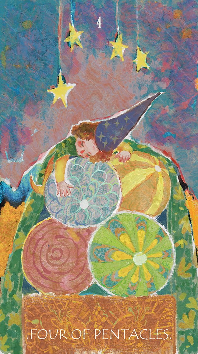 In the quiet of night, a tired pixie sleeps soundly, surrounded by four beautiful temari balls made of rare flowers and fruits—symbols of his hard-earned rewards and cherished treasures. These are gently covered by a green brocade embroidered with golden leaves, echoing the message of the Four of Pentacles: a firm grip on one’s possessions and treasures. In life, like the pixie, we strive to protect our wealth, emotions, and valuable memories, often fearing they may slip away.