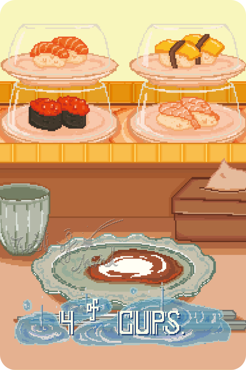 This card gives a sense of weariness, as if the things around you have repeated so many times that you have become numb. The endless rotation brings monotony, a feeling of “I’ve seen this routine way too many times.” That is why the illustration features very common sushi, clearly lacking stimulation or freshness. It is as if you can already imagine the ordinary taste before eating, and similarly, you can already imagine the predictable outcome of events you haven’t even experienced yet.