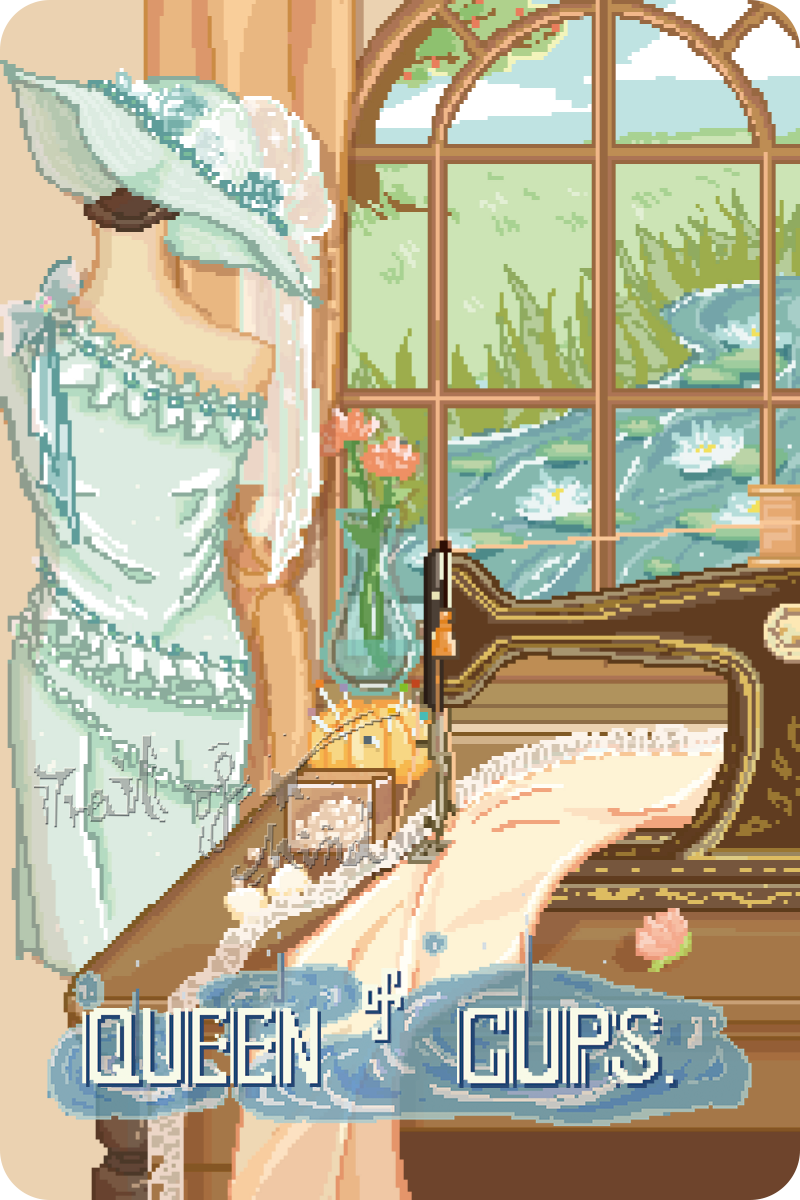 The wide window shows that her world is not limited to the room she sits in. Her vision is broad and accepting. The water and small water lilies outside hint at emotional richness and unending creativity. The flowing water continues into the blue garment she has already created, showing how her awareness and imagination take form through her hands. The pink outfit she is sewing now may be inspired by the roses on the windowsill. In the distance, fruit has appeared on the trees, suggesting that something is about to mature.