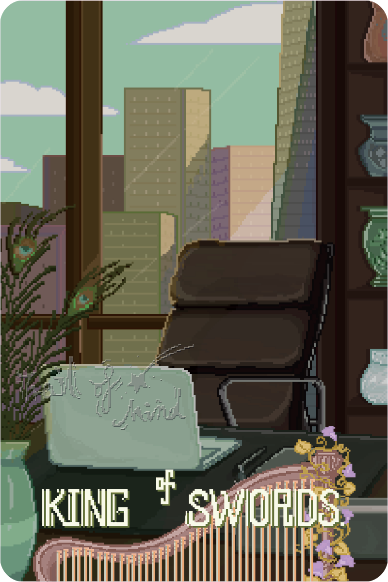 If the Queen of Swords represents objective fairness, the King of Swords believes he is fair based on his own understanding. As he climbs higher and sees farther, does he develop a sense of superiority, thinking others are “fools”? His authority is difficult to challenge. The decorative vases behind him are not used to grow flowers, suggesting he appreciates beauty but tends toward superficial display. The peacock feathers in the vase on the desk symbolize wisdom, but also hint at coldness and distance.