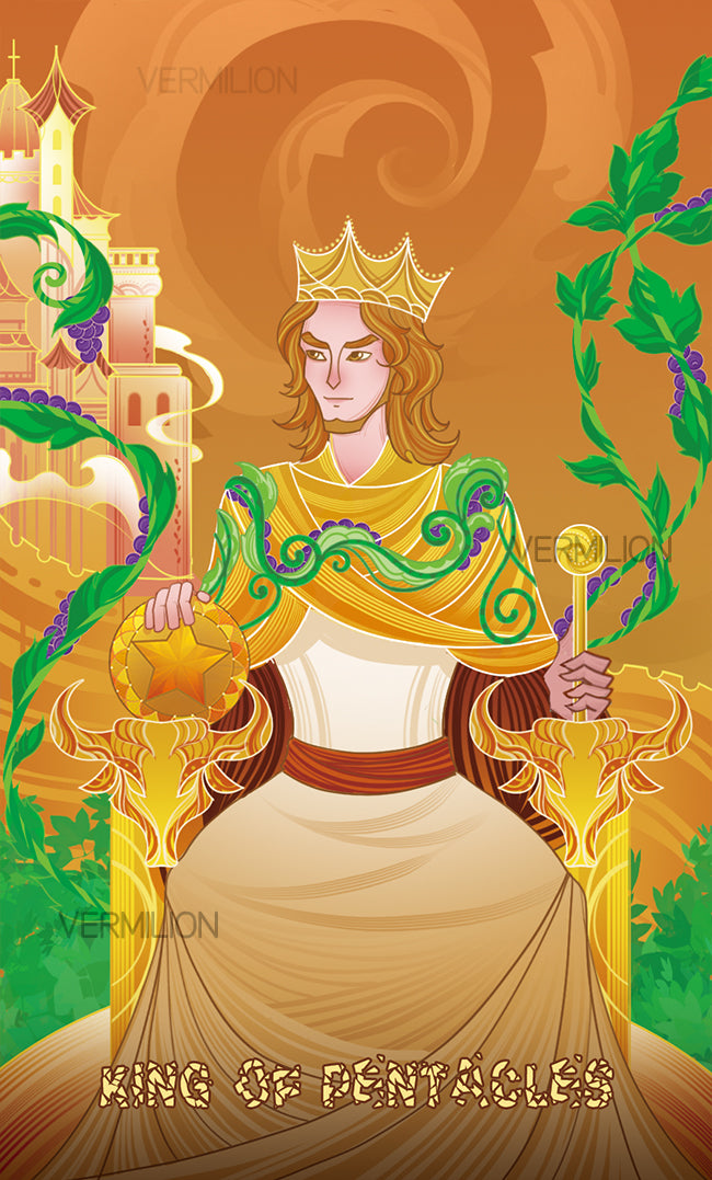 The King enjoys living in the garden. The pentacle represents material wealth; the wand represents authority. The King embodies both leisure and power.