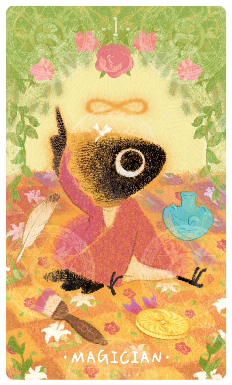 The newborn Uno embodies energy, wisdom, and success, with the infinity sign above its head signaling limitless potential. Seated confidently on the flowery cloth, Uno is given a dripping paintbrush, a wavy bottle, a delicate quill, and a gleaming gold medal – it must channel its powers wisely to harness these resources. One hand pointed to the sky and the other to the ground, Uno seems to be bringing divine inspiration into reality. The world is yours, Uno – choose your path, for you are free!
