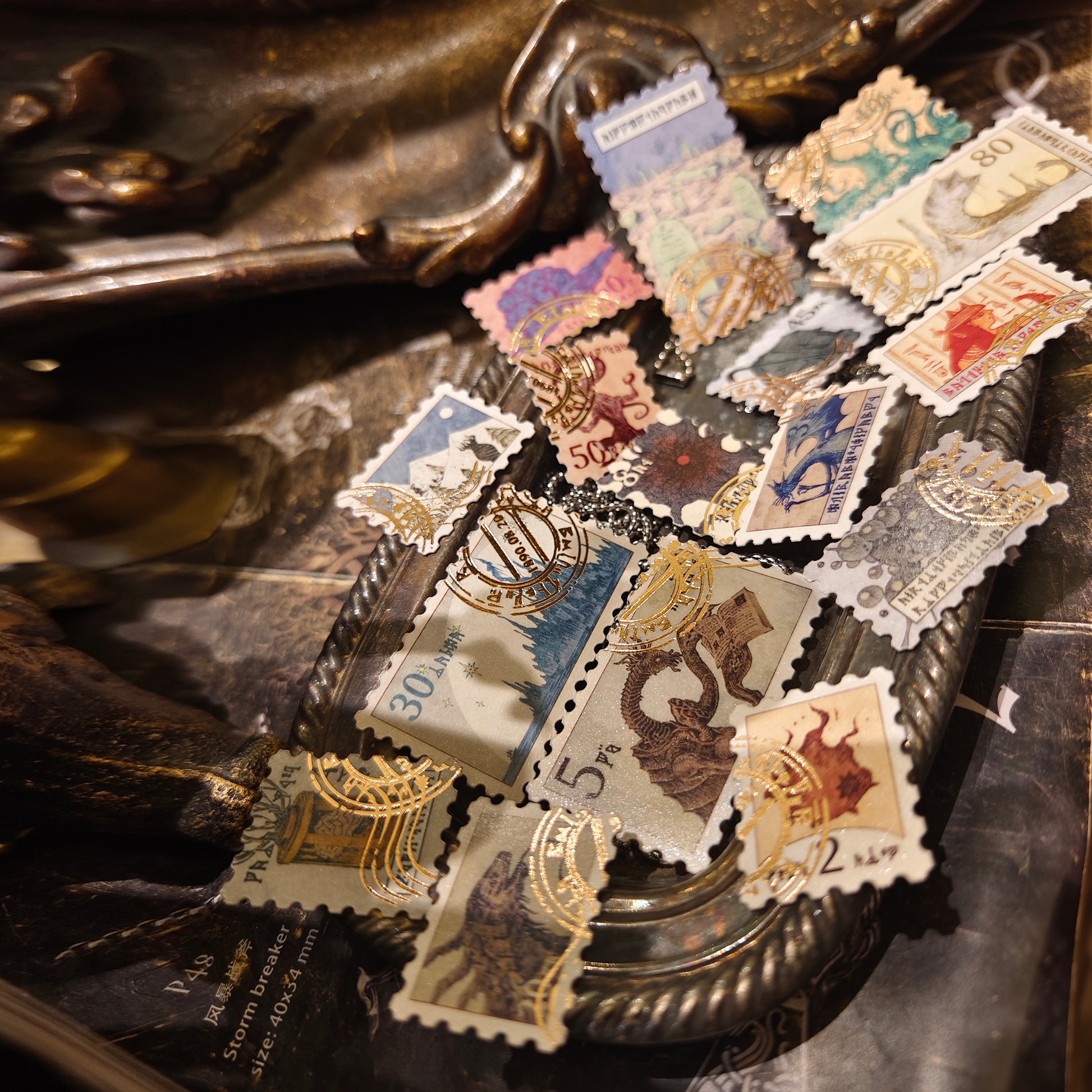 - Techniques: antique bronzing (postmark)