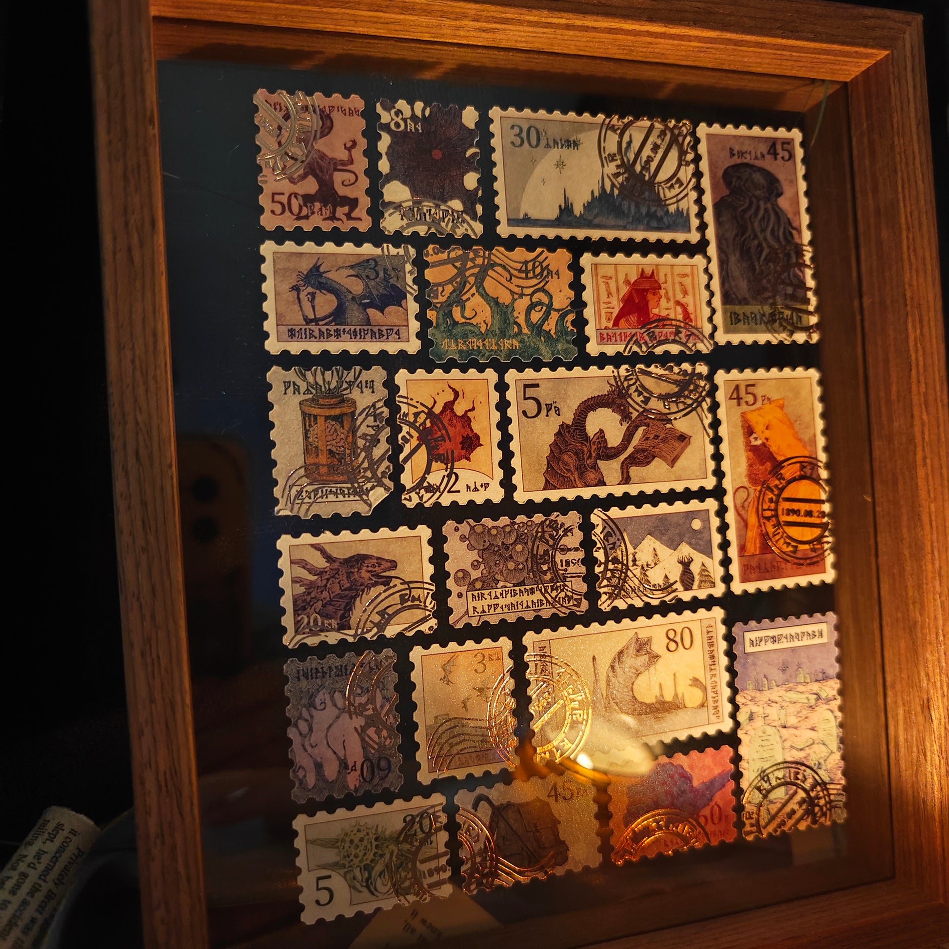 This assemblage is tastefully designed with a vintage seatime aesthetics. Each of the 20 stamps portrays a Lovecraftian character like a fossil picture, transporting you back to a time when every correspondence held a tale of its own. The entire collection paints a flight of fancy about the glorious Age of Discovery, a bygone era filled with the thrill of the unknown.