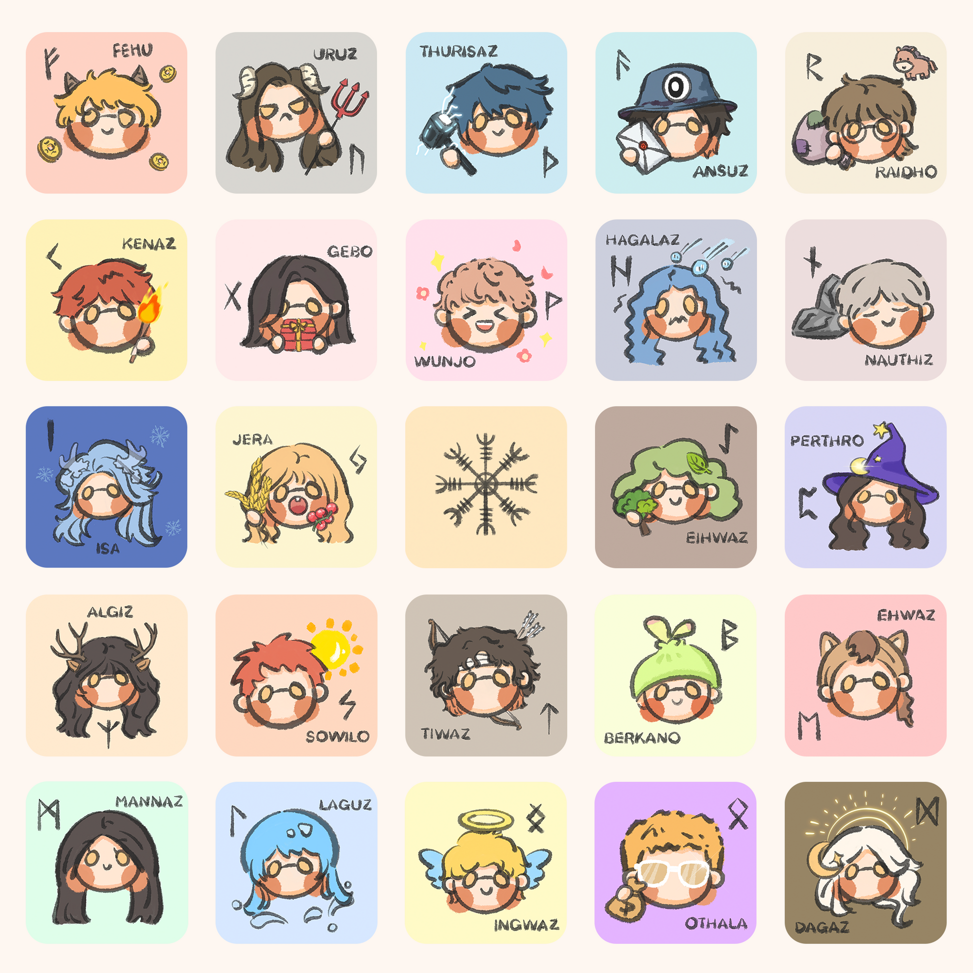 This rune deck is illustrated with simple, endearing brushwork in the style of cartoon doodling. Each of the 24 Norse runic symbols is associated with a quirky and an adorable cartoon figure. The warm, low-saturation color palette is hoped to have a soothing, therapeutic effect on viewers.