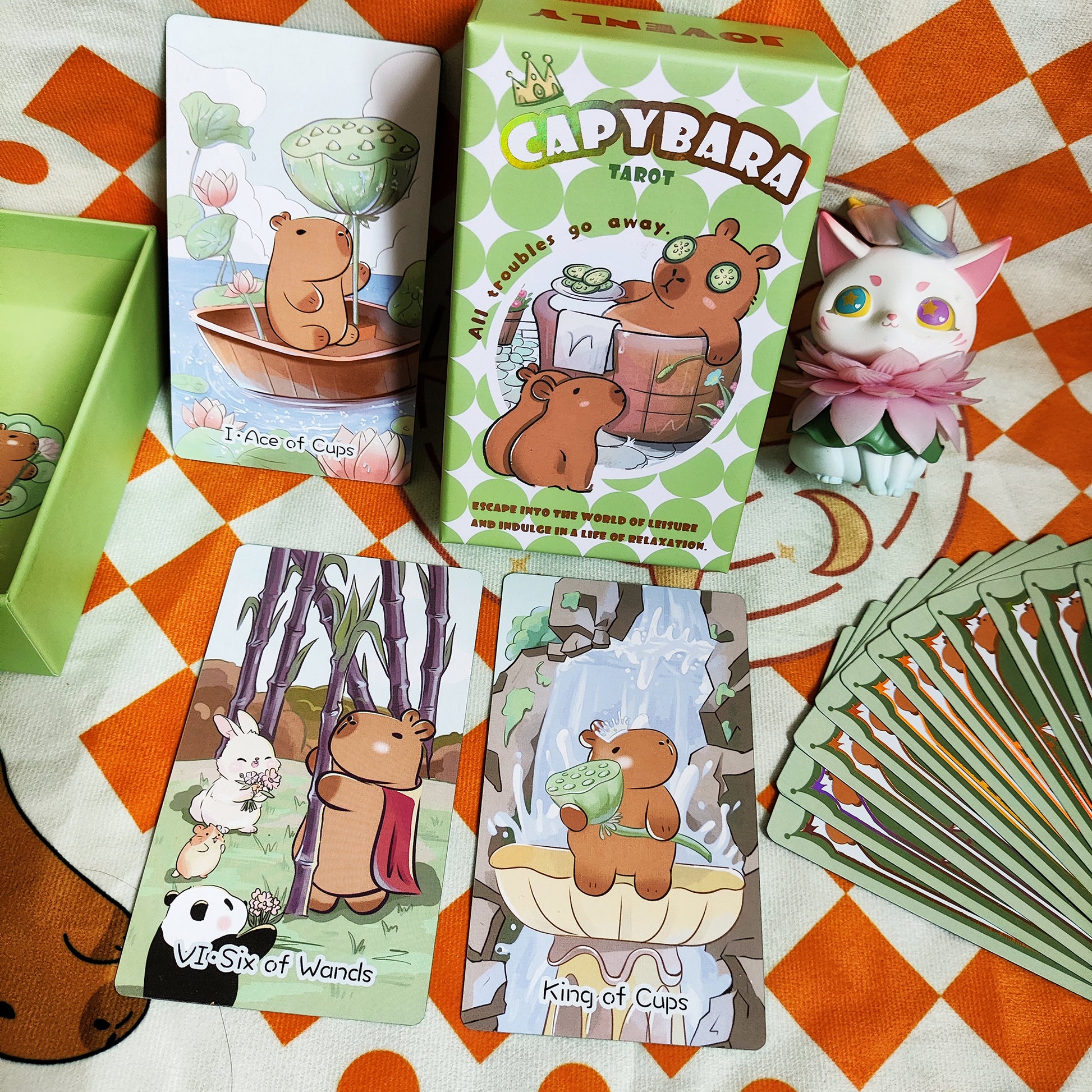 Get this deck if you vibe with the capybaras' chill energy! A reading with these laid-back little guys might not unlock the secrets of the universe, but it will trade your worries for a few grins. Even better, check out the suit symbols, all reimagined as capybara essentials: sugarcanes for Wands, lotus seedpods for Cups, feathers for Swords, and oranges for Pentacles. Weird? Absolutely. But how adorable??