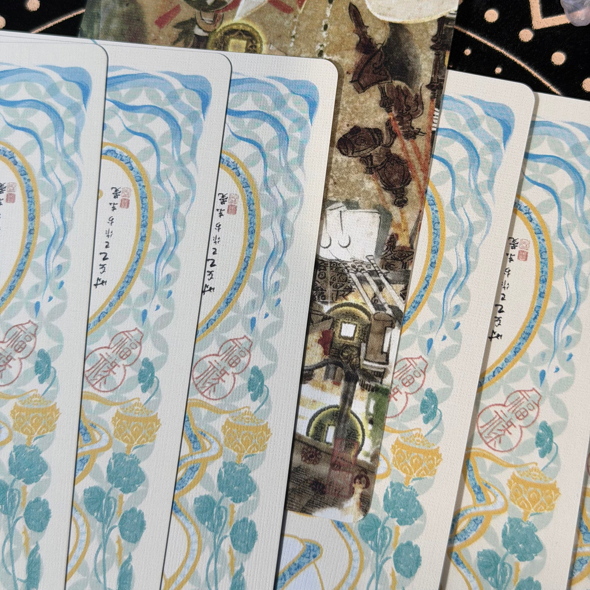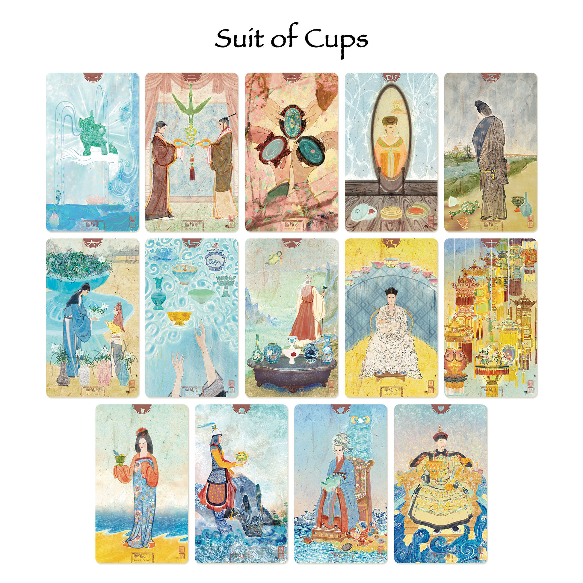 From the robes of imperial consorts to the glint of legendary weapons, this deck, infused with the gravity of time, offers a glimpse of China's vast cultural legacy. Its brushwork and texture echo classical Chinese paintings while its palettes draw from aged pigments and historical materials like jade, bronze, and ceramics. Spread and appreciate: