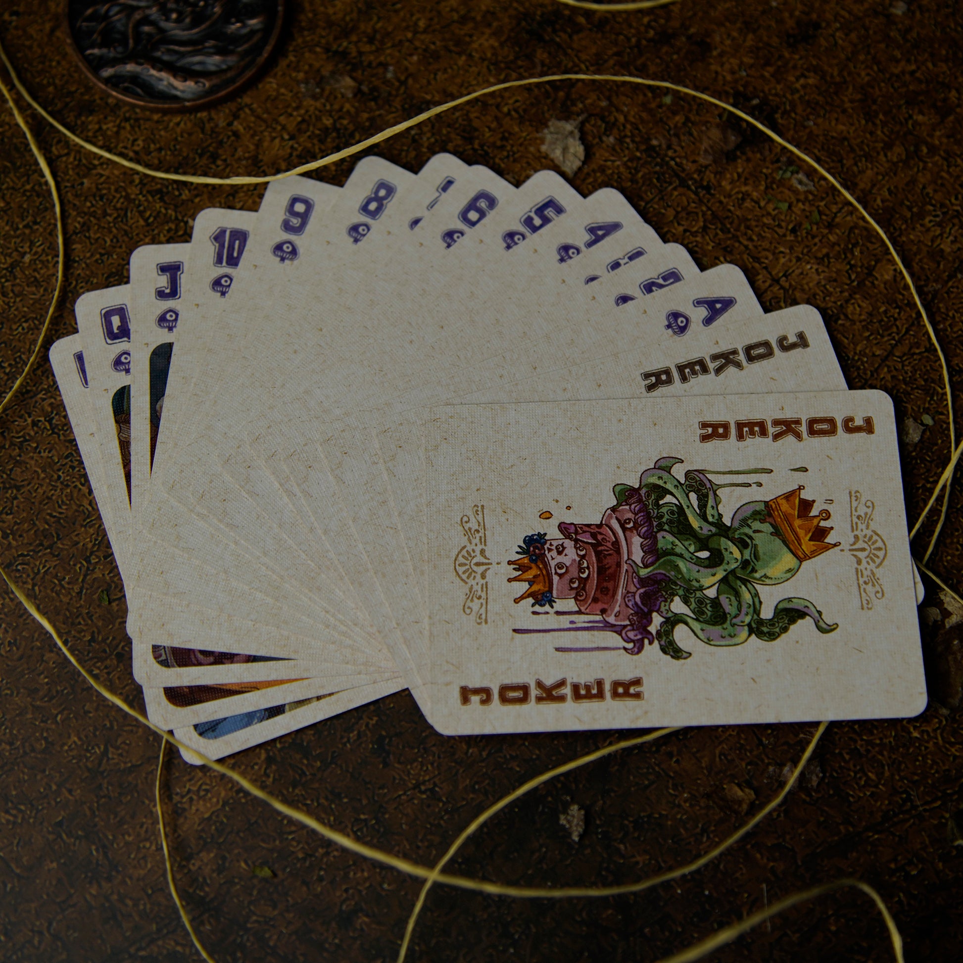 Slimy tentacles crawling under the table; a dishful of globules covered in mucus rolling in the frying pan; the Deep Ones' eyeballs soaked in bubbling cocktails, giving off a forceful oceanic smell... Distinguished by its mixture of playful and enigmatic tones, this food-themed poker deck takes inspiration from the Cthulhu Mythos. With their imaginative approach and cartoonish brushwork, the artists borrow from typical Lovecraftian horror elements to make eerie, lovely "dishes" out of distant, grotesque entities. In the dim yellow light, let the feast with Cthulhu begin!