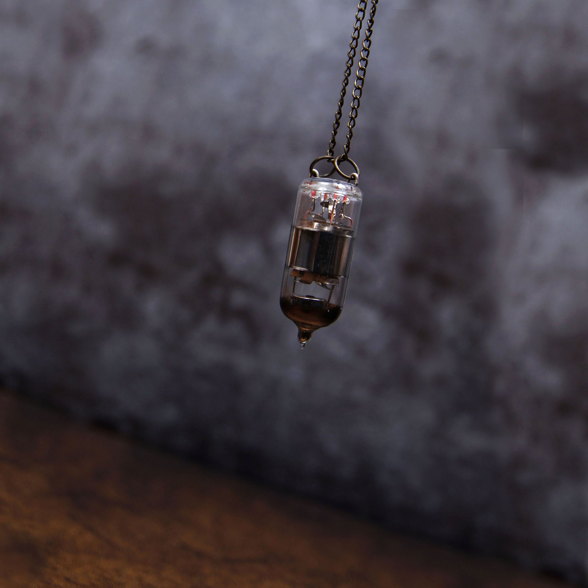 A nod to inspirational minds, this conversation starter captures the spirit of curiosity. It's crafted to resemble an old-school electron tube, whose intricate inner workings are visible through the glass – like peering into a tiny mysterious relic from an alchemist's lab. Suspended from a metal-finish chain, it adds a touch of retro-futuristic charm to any outfit. Perfect for tinkerers, dreamers, lovers of all things steampunk.