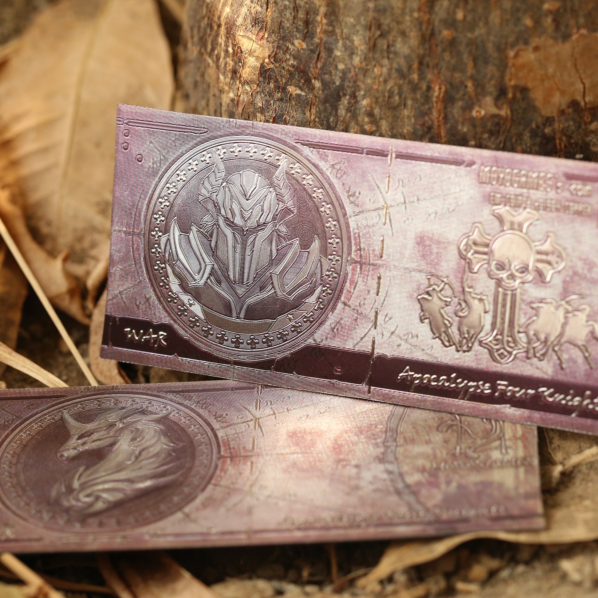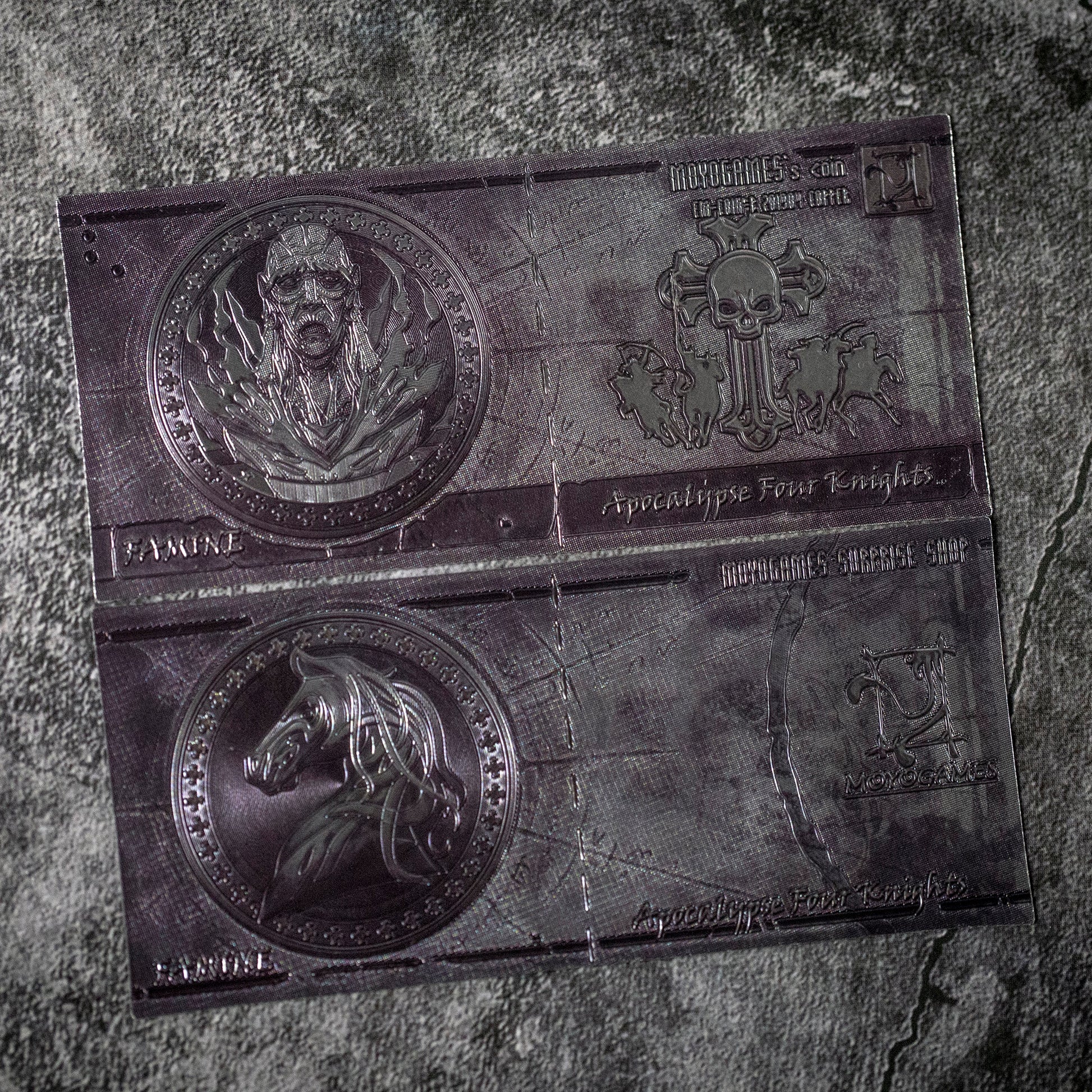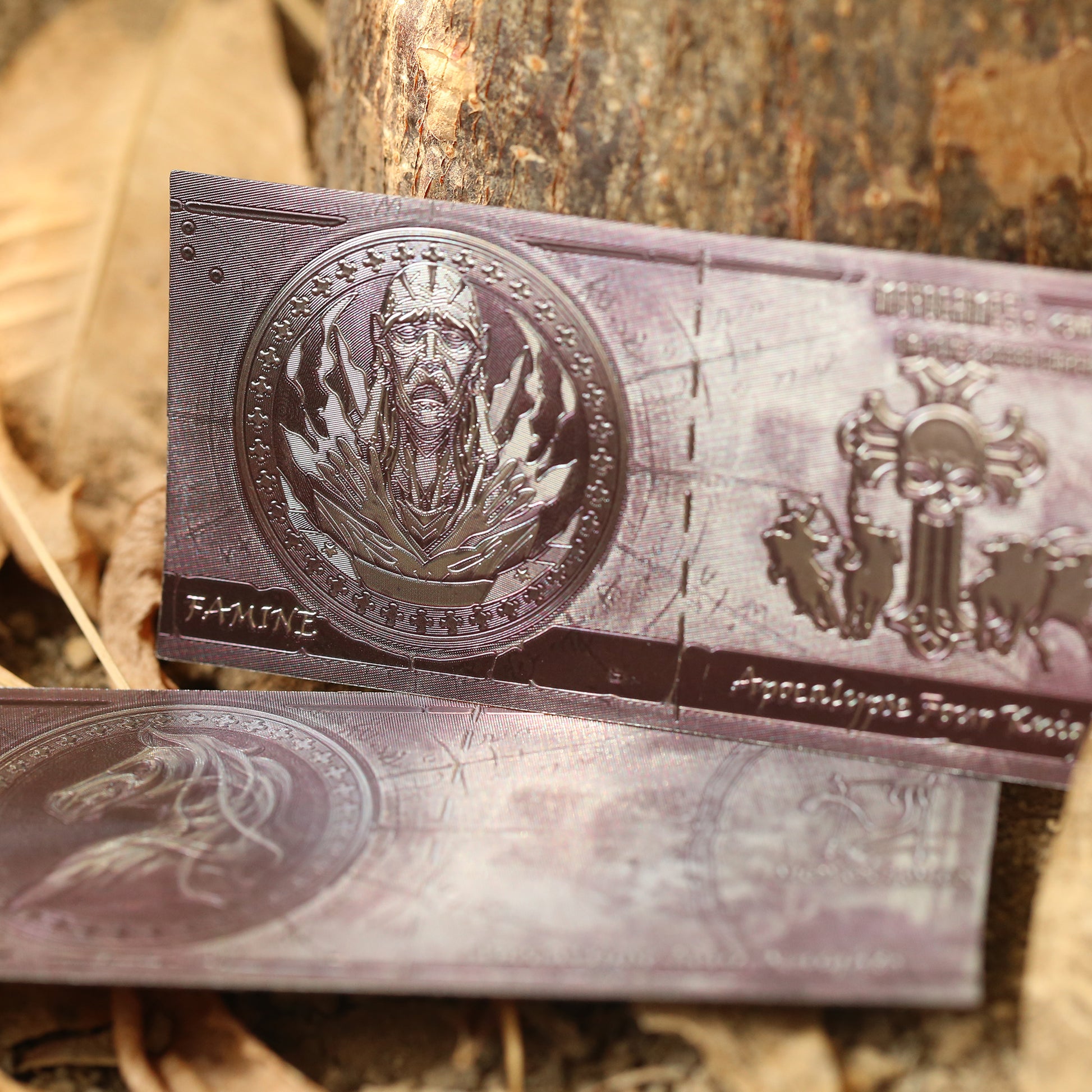 Unleashed upon the world as a series of divine judgements, the Four Horsemen of the Apocalypse embody powerful forces (plague, war, famine, and death) that bring about destruction and turmoil during the end times. This collection includes four gold/silver foil cards. You may use them as bookmarks, pretend currency, or simple a stunning art collection.