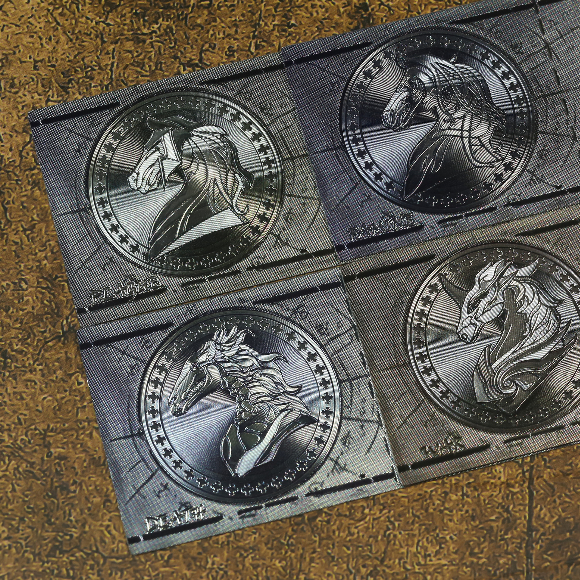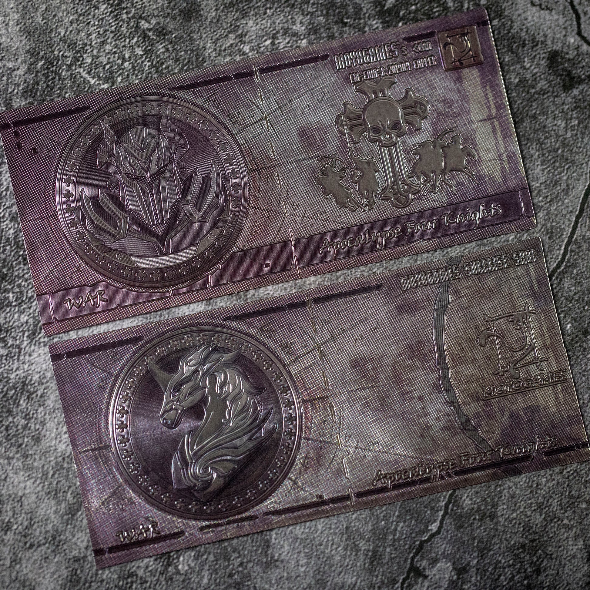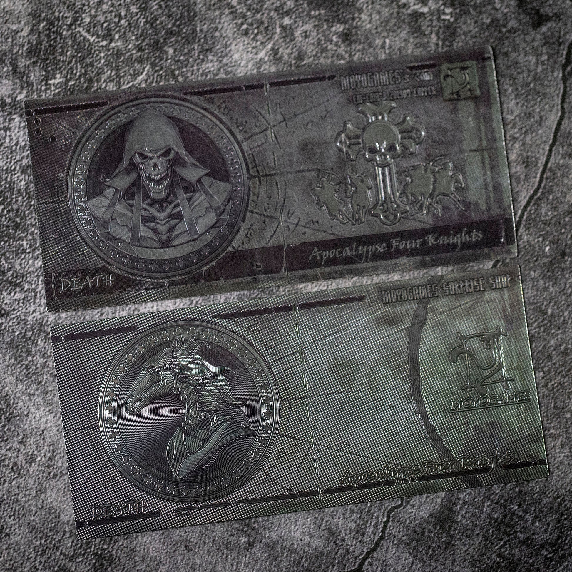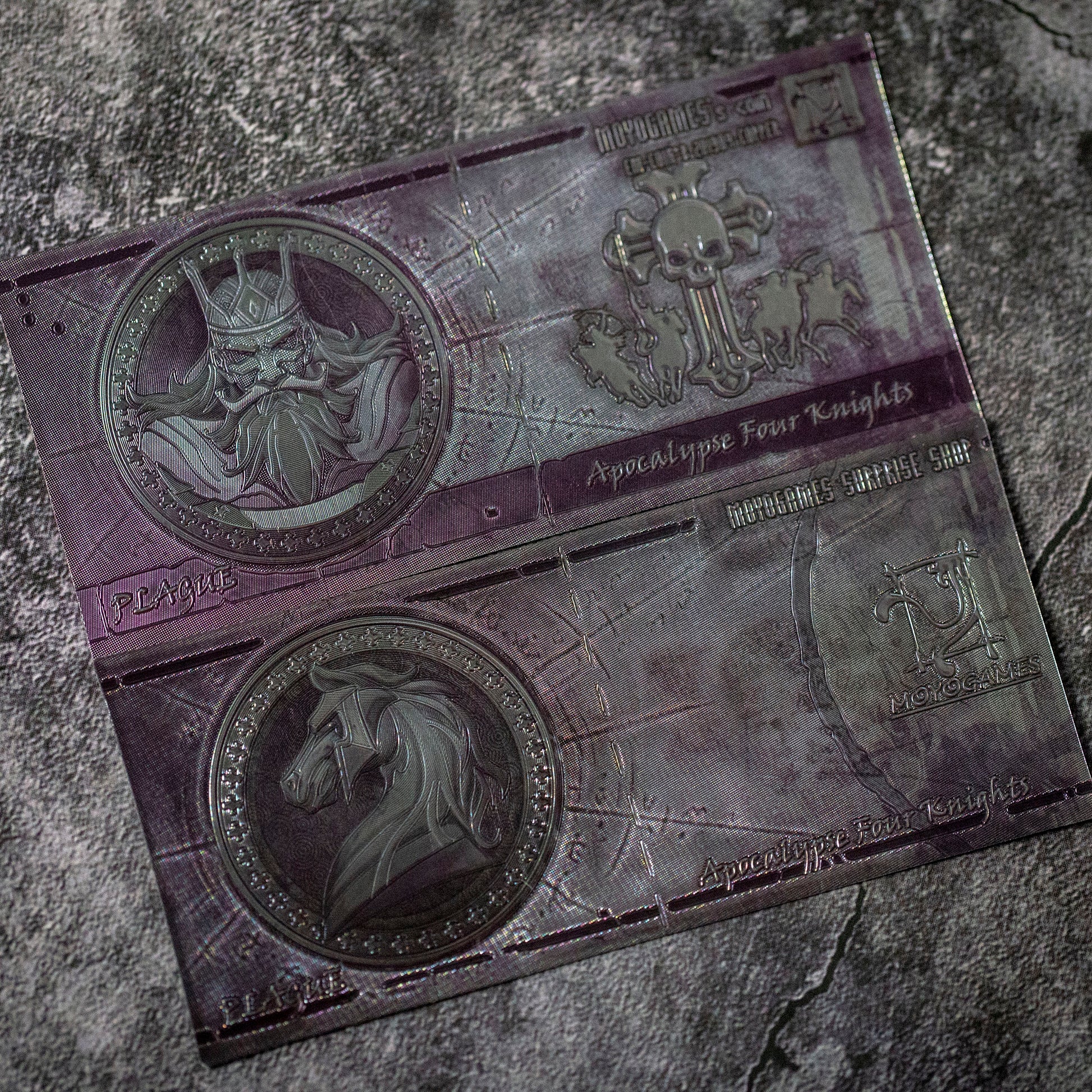 Unleashed upon the world as a series of divine judgements, the Four Horsemen of the Apocalypse embody powerful forces (plague, war, famine, and death) that bring about destruction and turmoil during the end times. This collection includes four gold/silver foil cards. You may use them as bookmarks, pretend currency, or simple a stunning art collection.