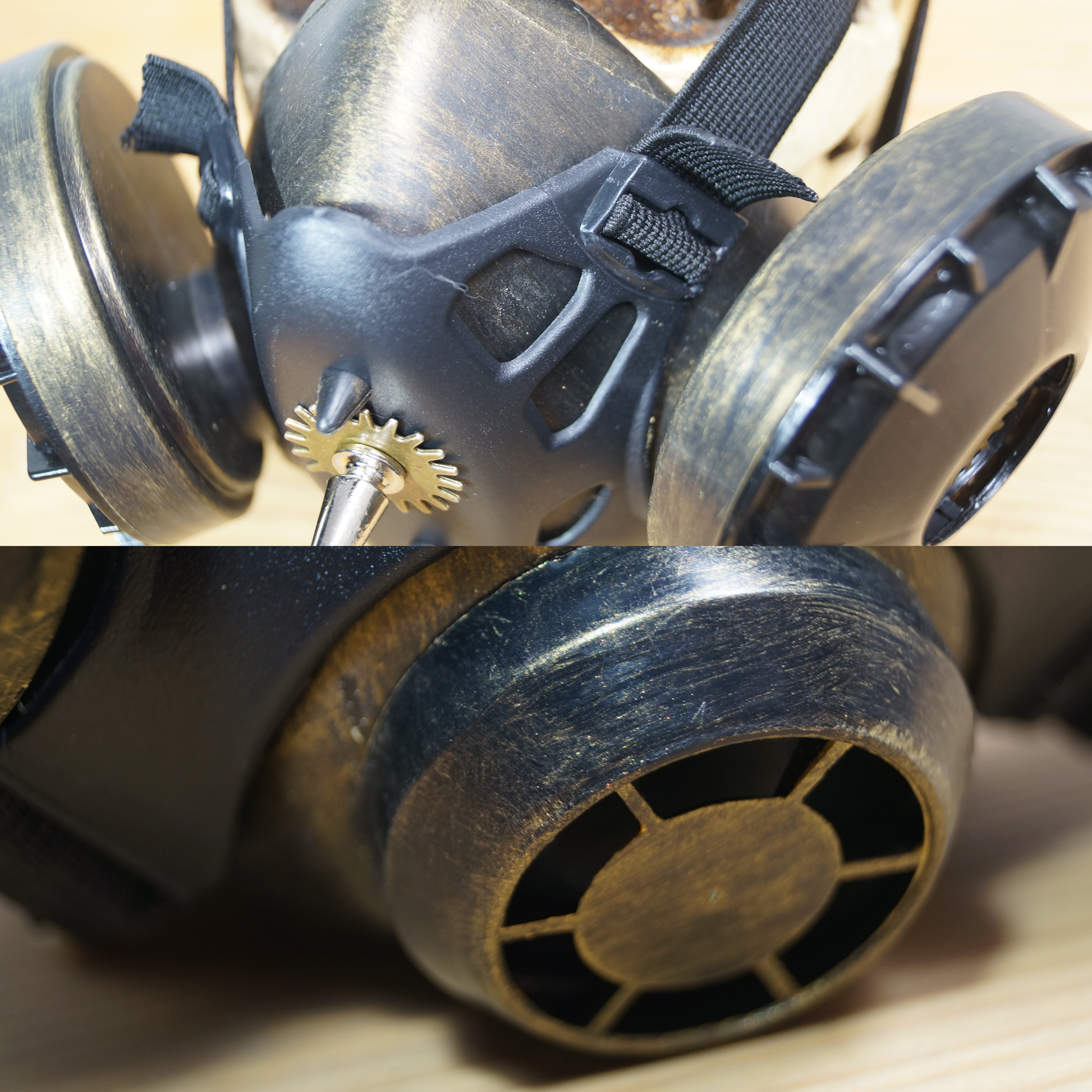 - Parts of the gears are intentionally distressed to create a worn-in look. Uneven colors and textures are results of the antique coating process.