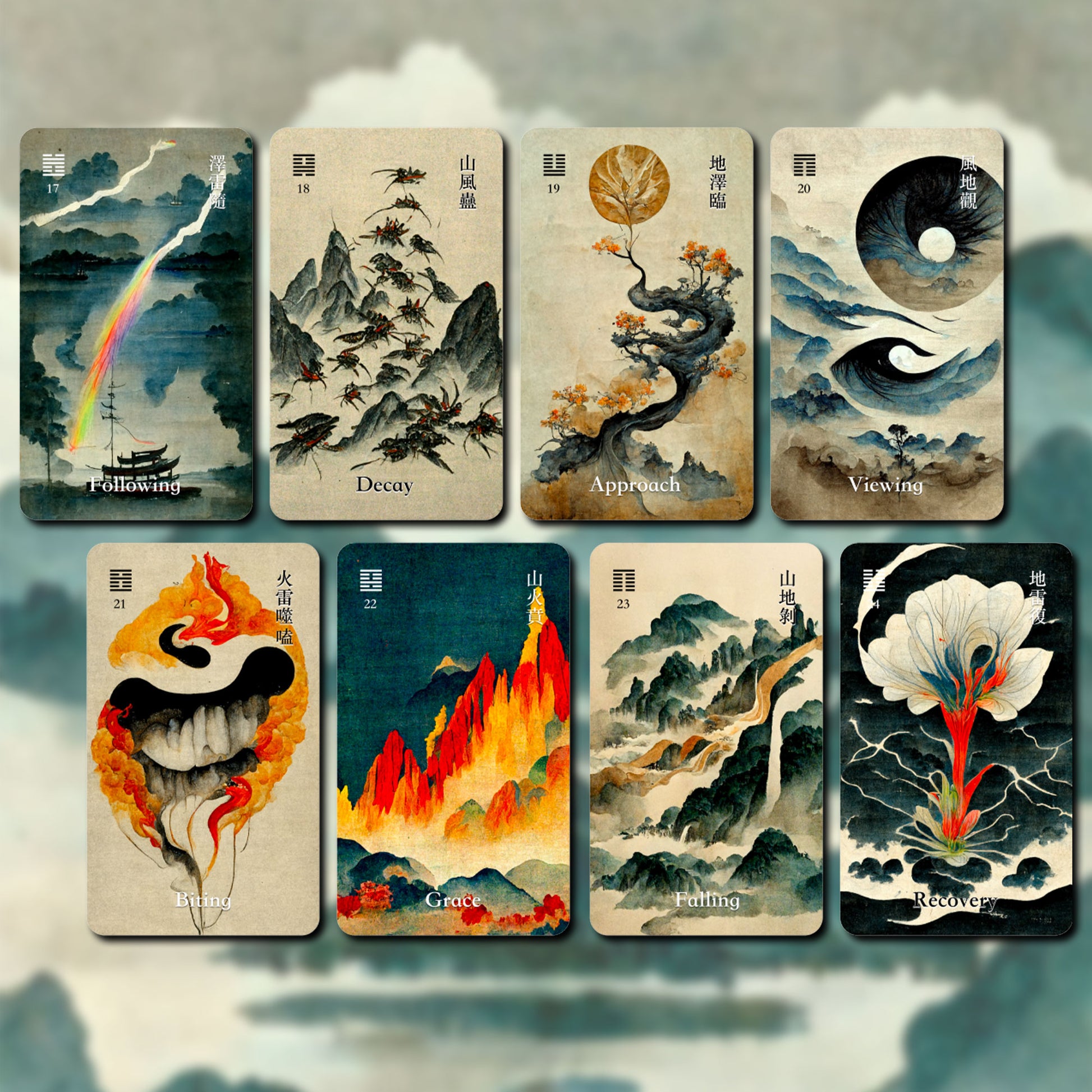 Marrying eastern and western fortune-telling traditions, this oracle deck is inspired by the I Ching (Book of Changes), an ancient Chinese divination text and one of the oldest Chinese classics. All 64 cards are illustrated with the aid of AI in addition to conventional software like Photoshop and Figma, featuring paintings of China's landscape sceneries.