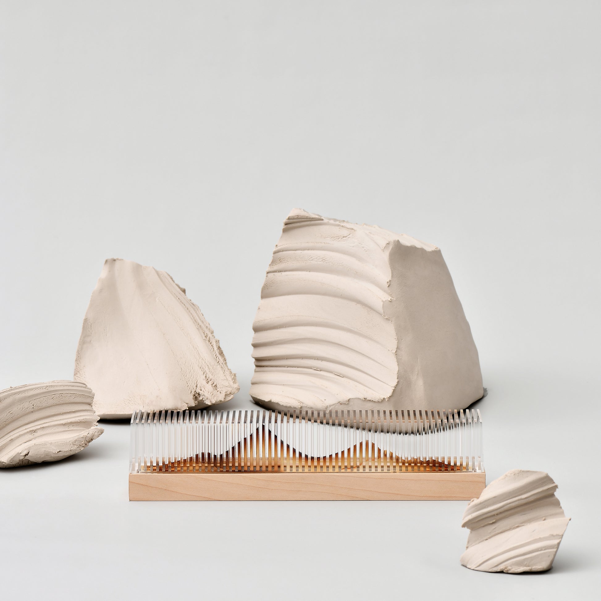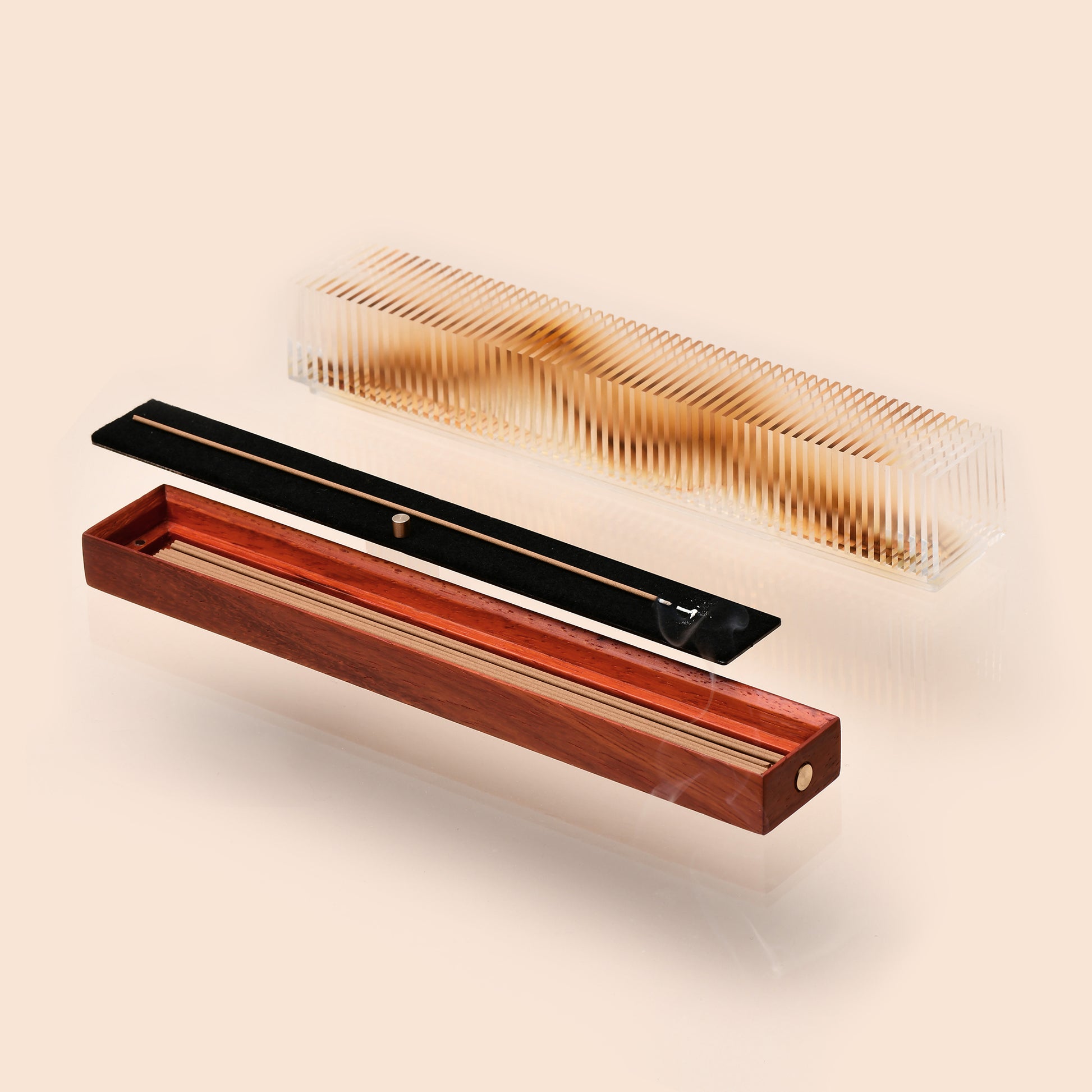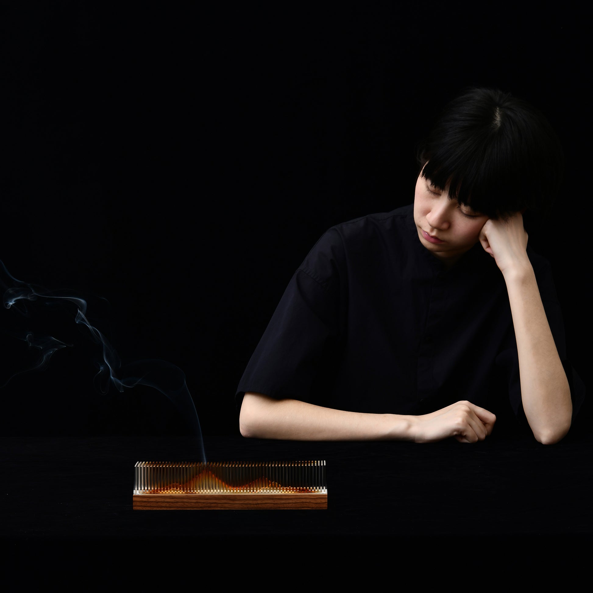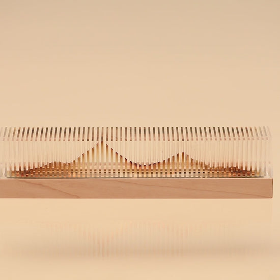 A transparent acrylic "mountain" rises from a solid wood base. When unlit, it appears as a serene, crystalline ridge. As incense burns, smoke traces the contours within, slowly revealing soft amber silhouettes. Time becomes the brush, smoke the ink, composing an unfinished landscape in motion.
