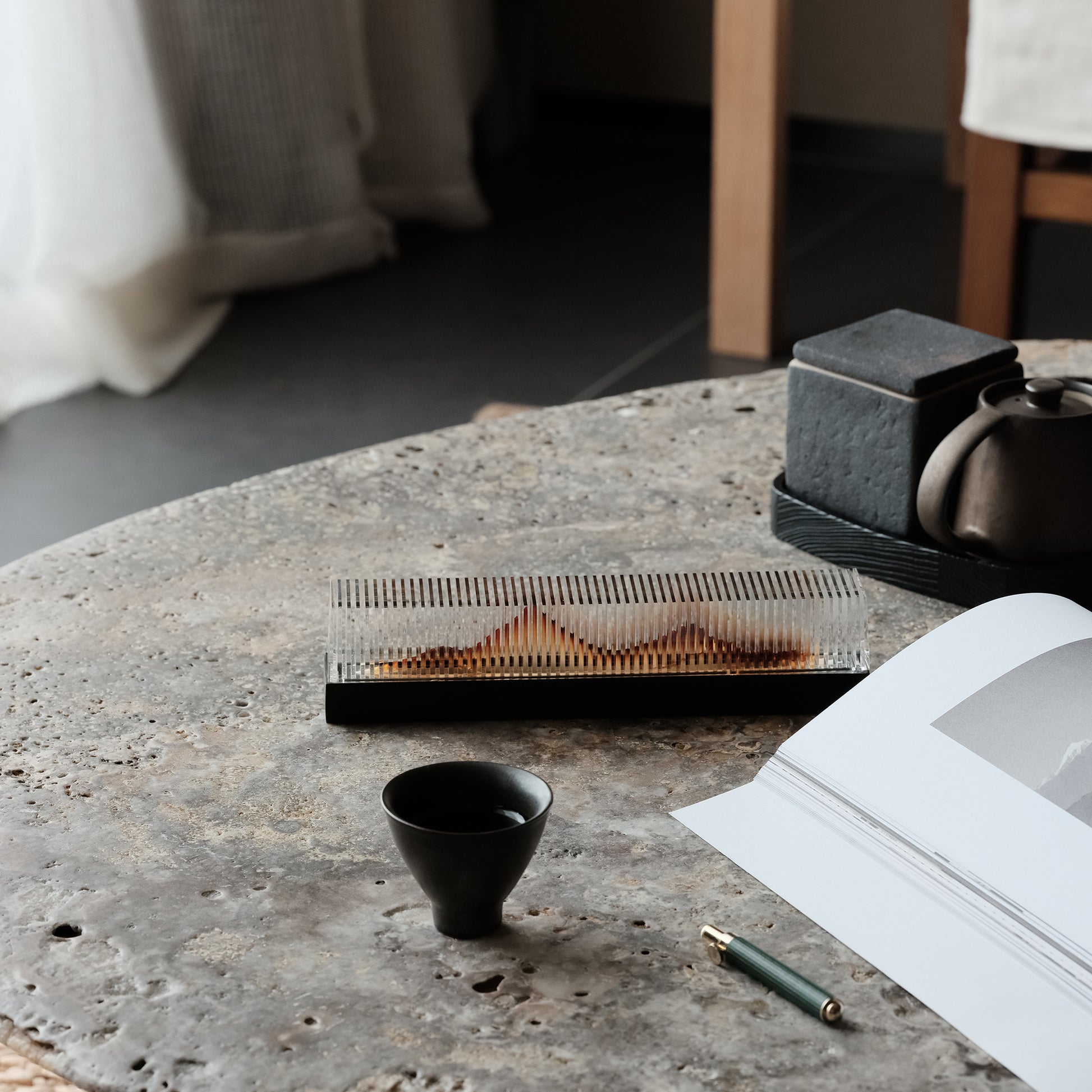 The incense (37 minute burn time) is crafted in collaboration with the Taiwanese heritage brand, Fushankodo, using naturally aged Indian sandalwood as its core material. Its scent is refined and gently sweet, offering a soothing, grounding experience.