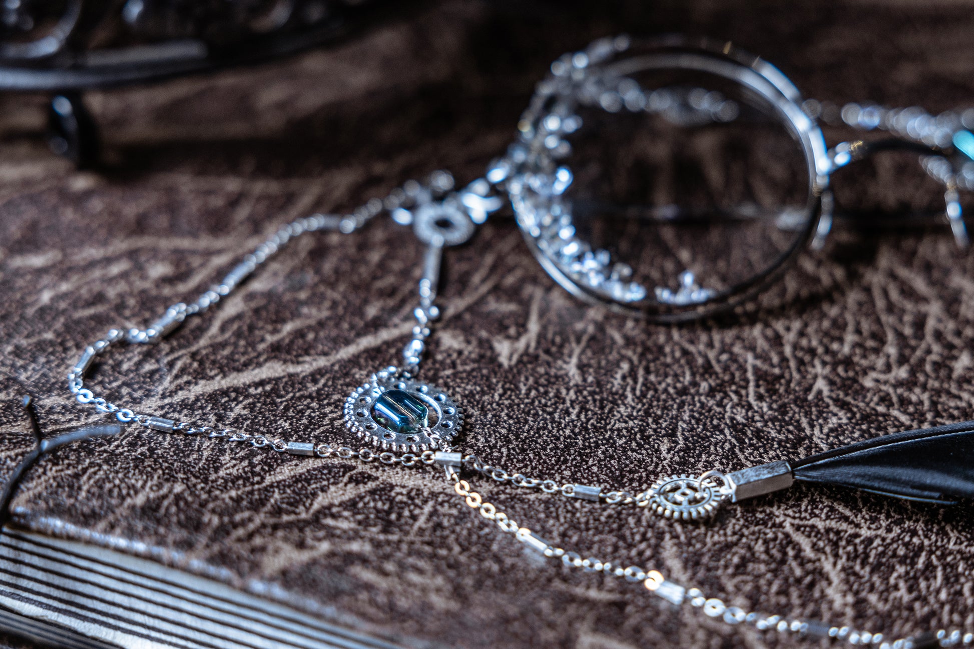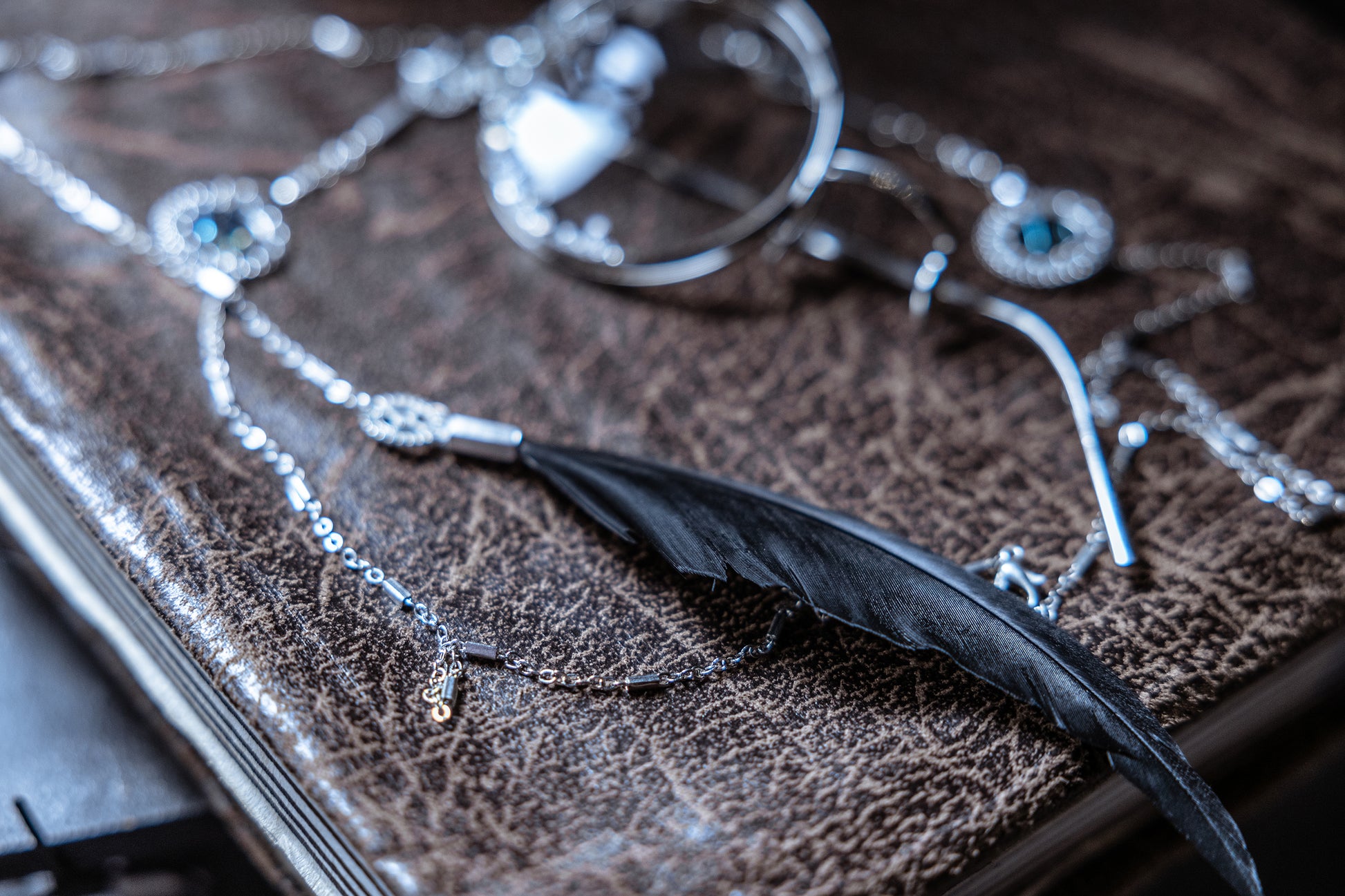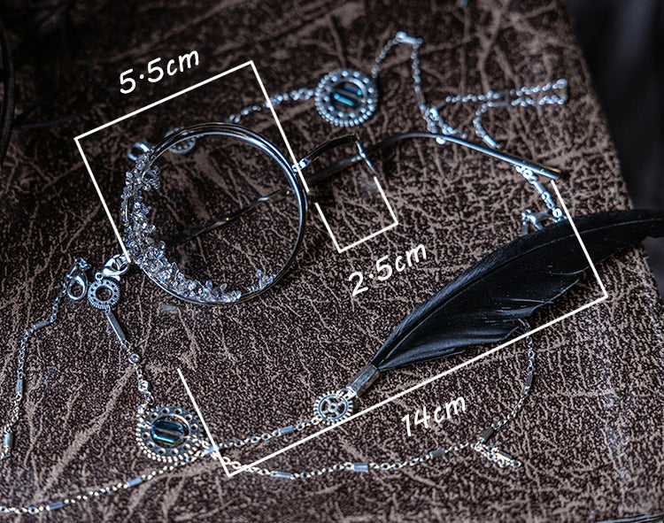 The monocle is Amon's unmistakable mark, a glinting symbol of his powerful presence. Our crystal-gilded design stays true to the novel's depiction, adding an otherworldly shimmer to this iconic piece. The temple and nose pad make it easier for the bones. The glasses chain, originated during Victorian times, is both ornamental and practical. Adorned with charms and a statement black feather, it echoes Amon's trickster nature. It also keeps the monocle secure and can be detached for use with regular glasses.