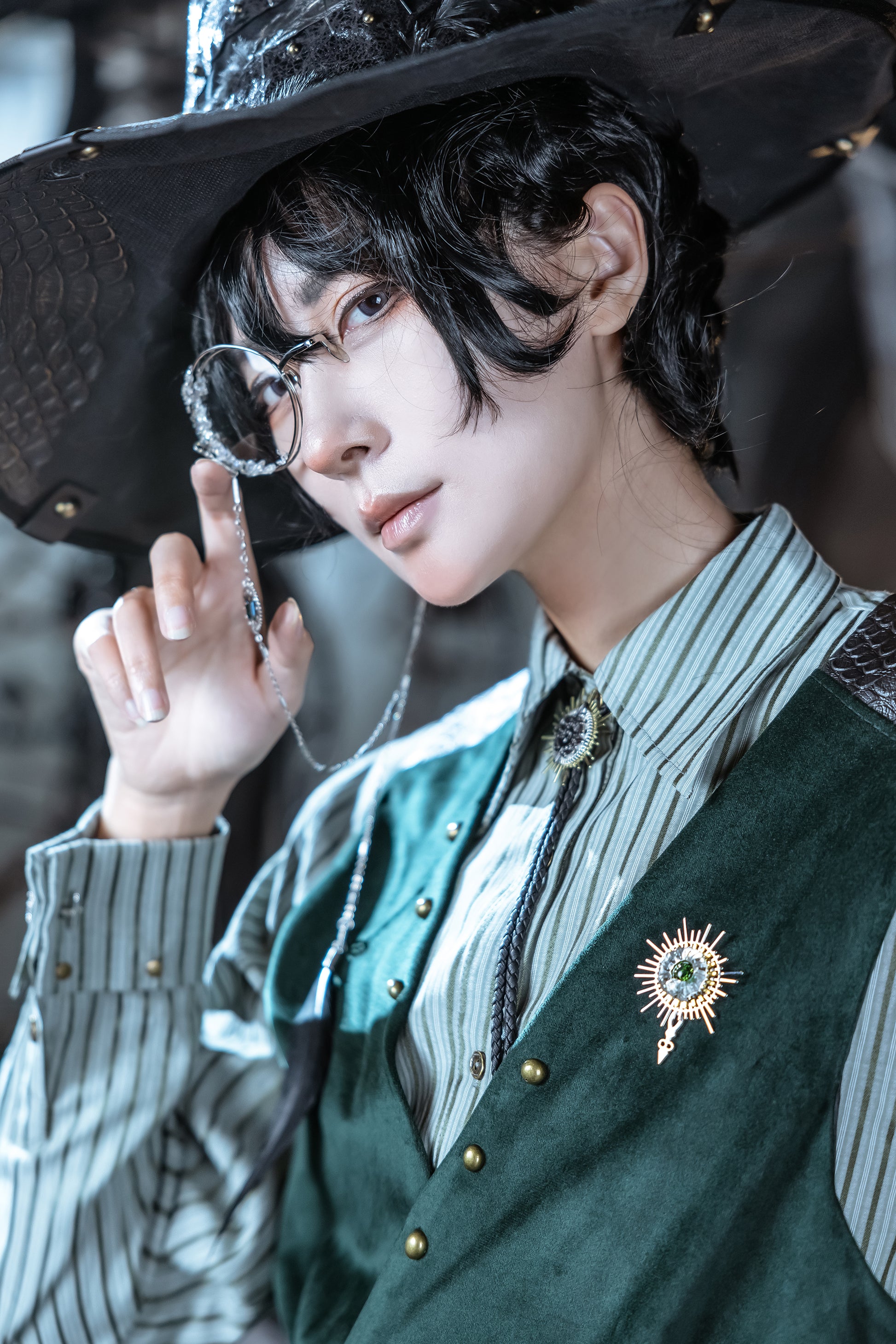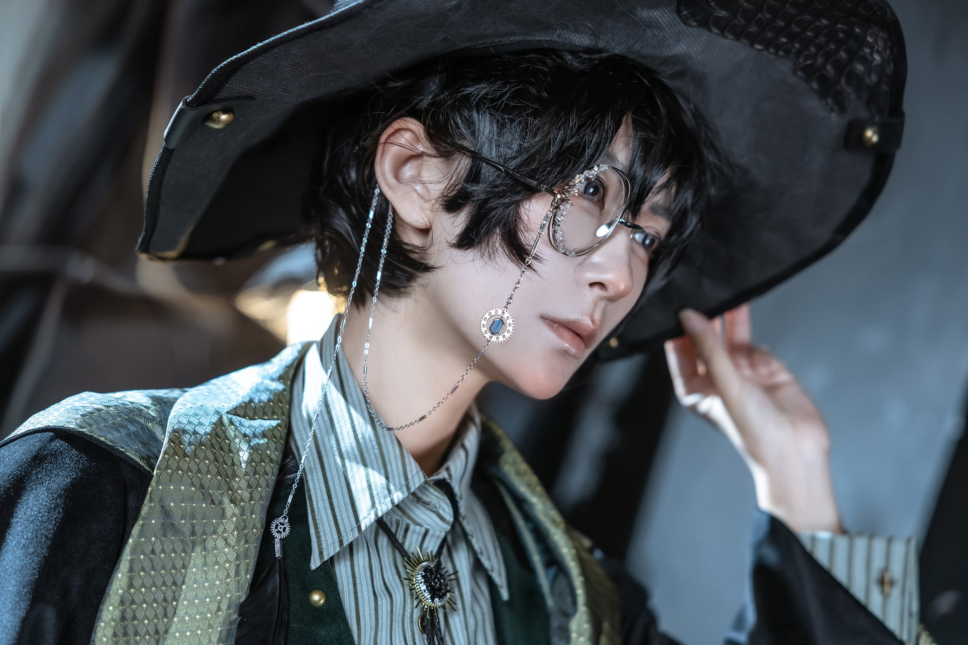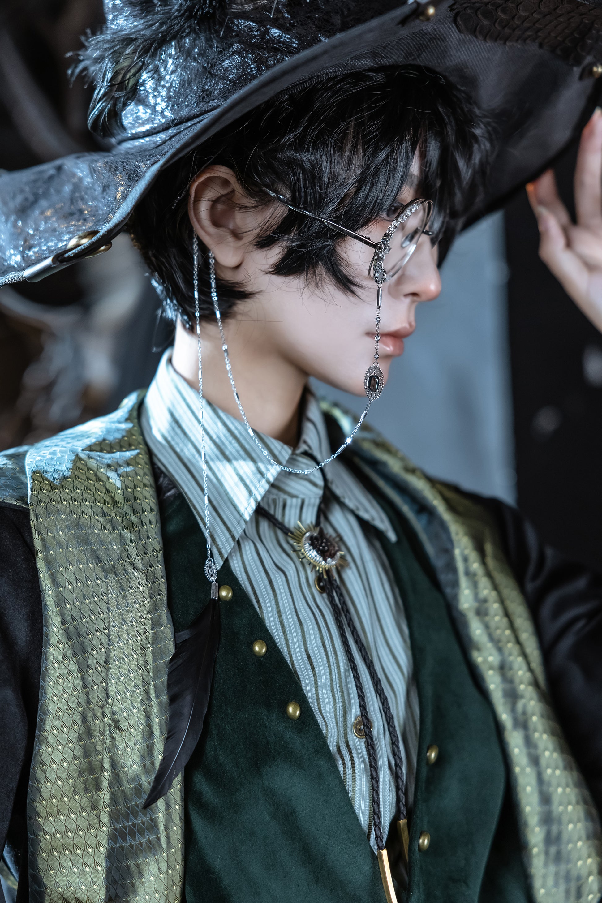 The monocle is Amon's unmistakable mark, a glinting symbol of his powerful presence. Our crystal-gilded design stays true to the novel's depiction, adding an otherworldly shimmer to this iconic piece. The temple and nose pad make it easier for the bones. The glasses chain, originated during Victorian times, is both ornamental and practical. Adorned with charms and a statement black feather, it echoes Amon's trickster nature. It also keeps the monocle secure and can be detached for use with regular glasses.