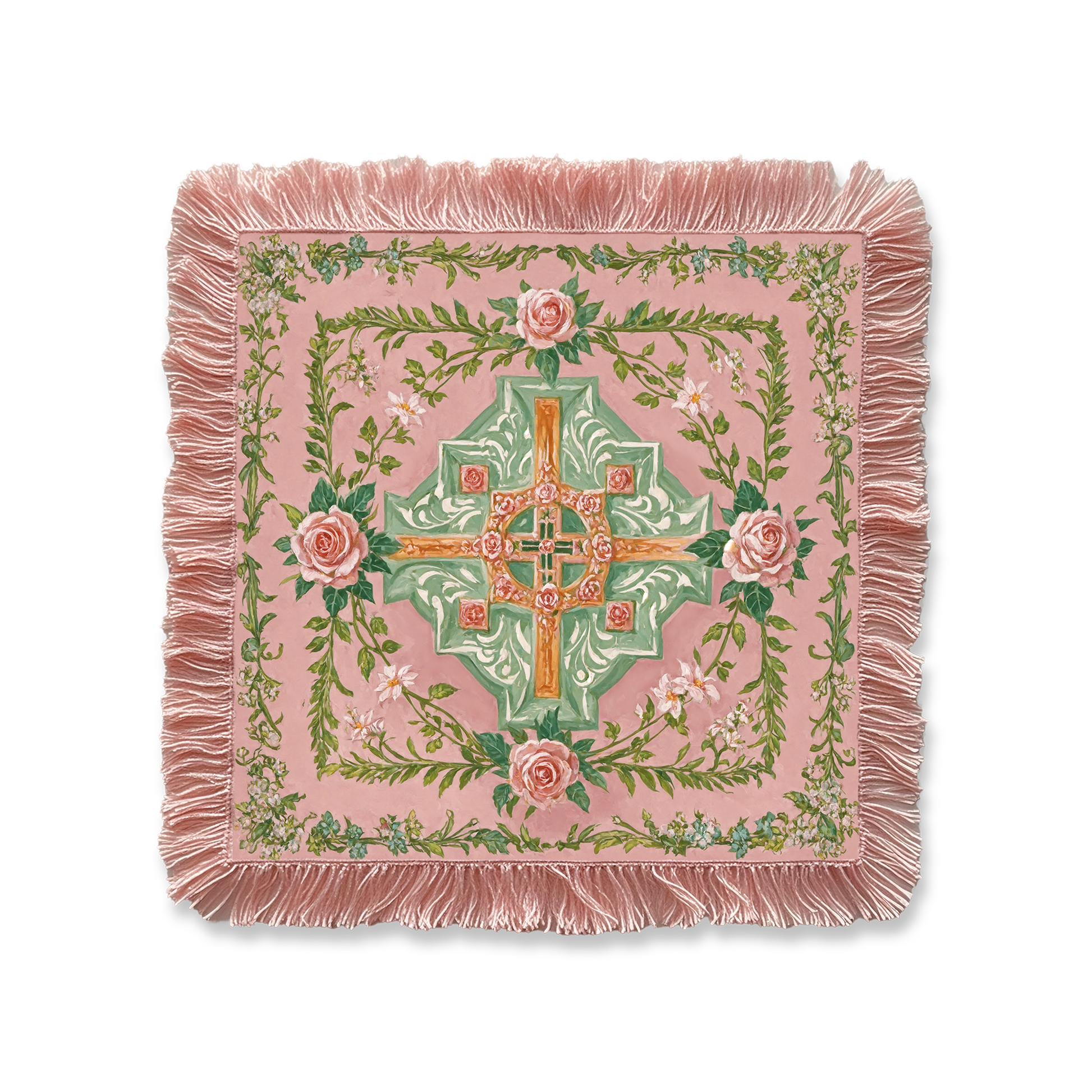 Finished with elegant tassel edges, these cloths blend romance and ritual in every detail. A soft yet sturdy weave provides a smooth, protective surface, while the velvety touch enhances each reading. The palette drifts through blush pinks, rose reds, sage greens, and antique golds, framing intricate patterns inspired by sacred devotion, garden vows, and celestial fate. Designed to complete and elevate your Renaissance Fantasy Tarot collection, transforming the table into a stage for beauty and intention. Available in three designs: Sacred Heart, Rose Cross, and Oracle Wheel.