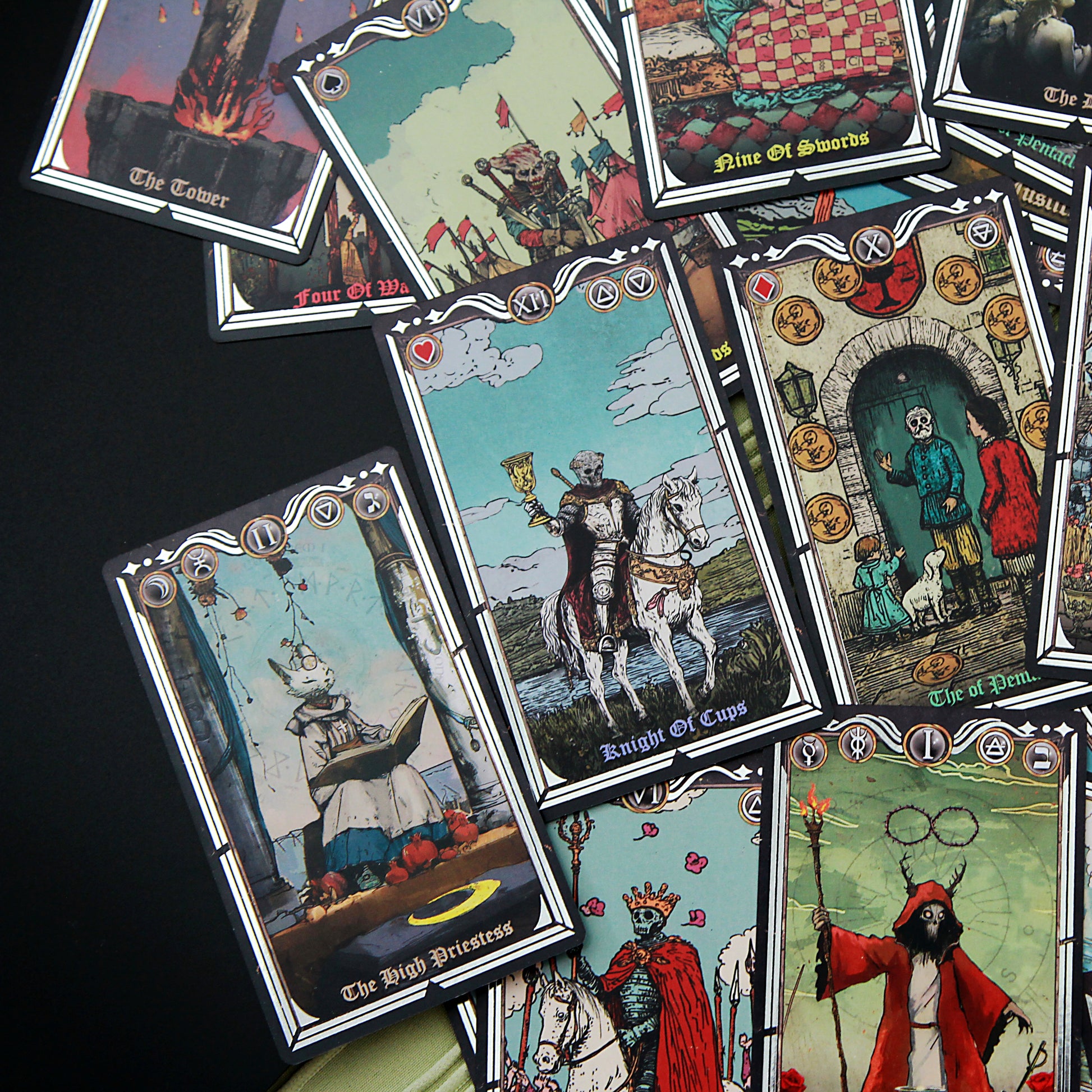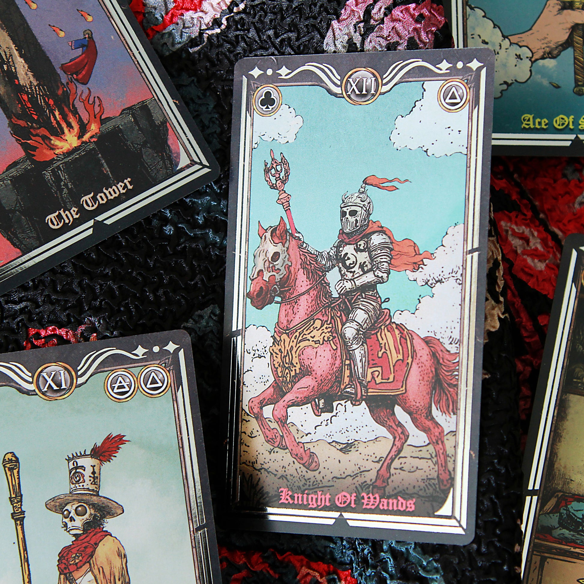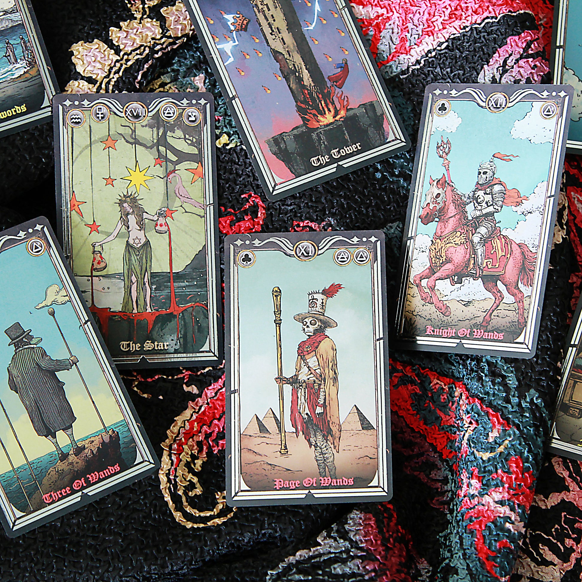 A haunting journey through the realms of dark fantasy, where the grotesque meets the sublime. Inspired by Gothic and surrealist arts, this deck boasts a moody palette and otherworldly motifs – from skeletal jesters and masked figures to barren forests and spectral creatures. Its shadowed aesthetic channels deep emotional truths and the allure of the unknown.