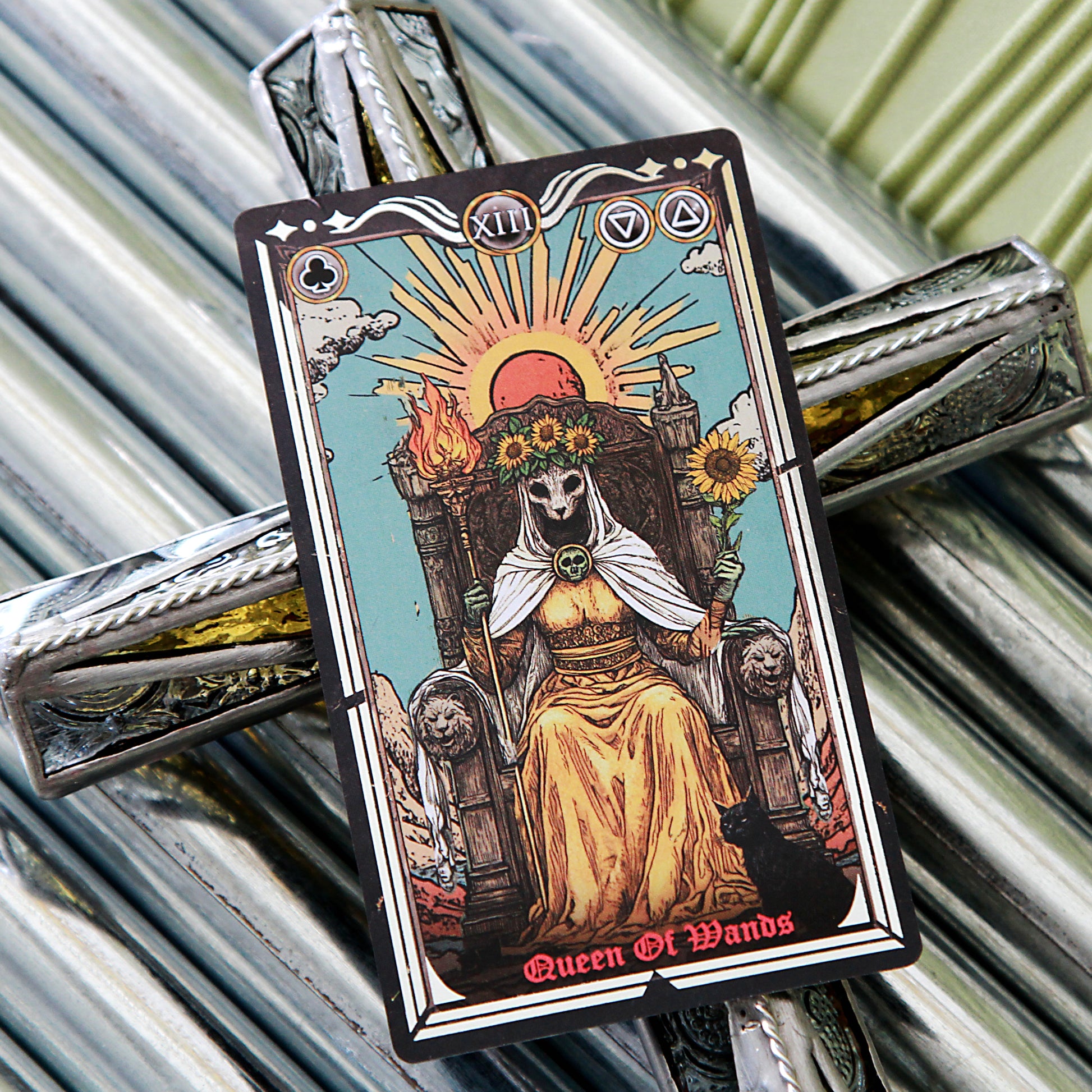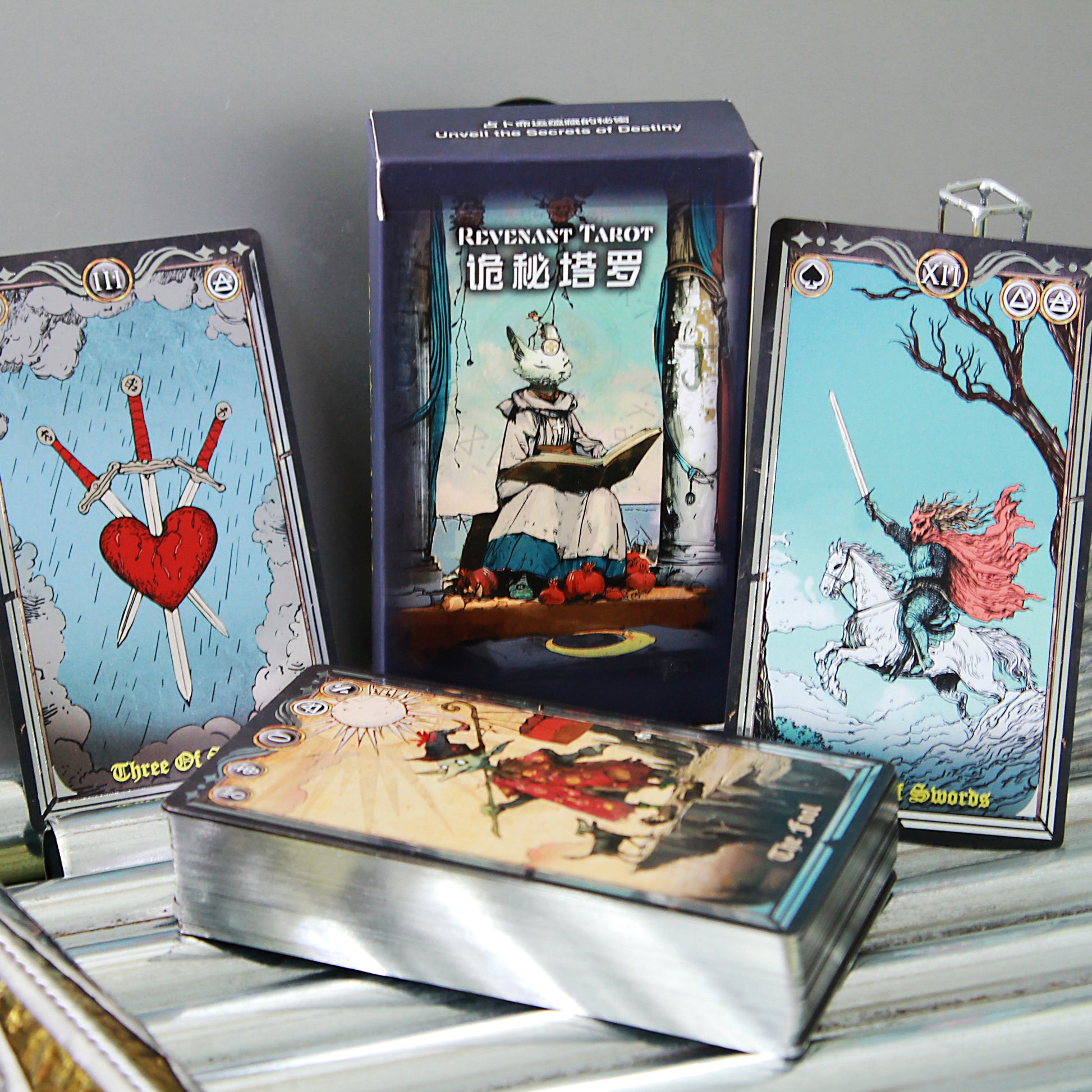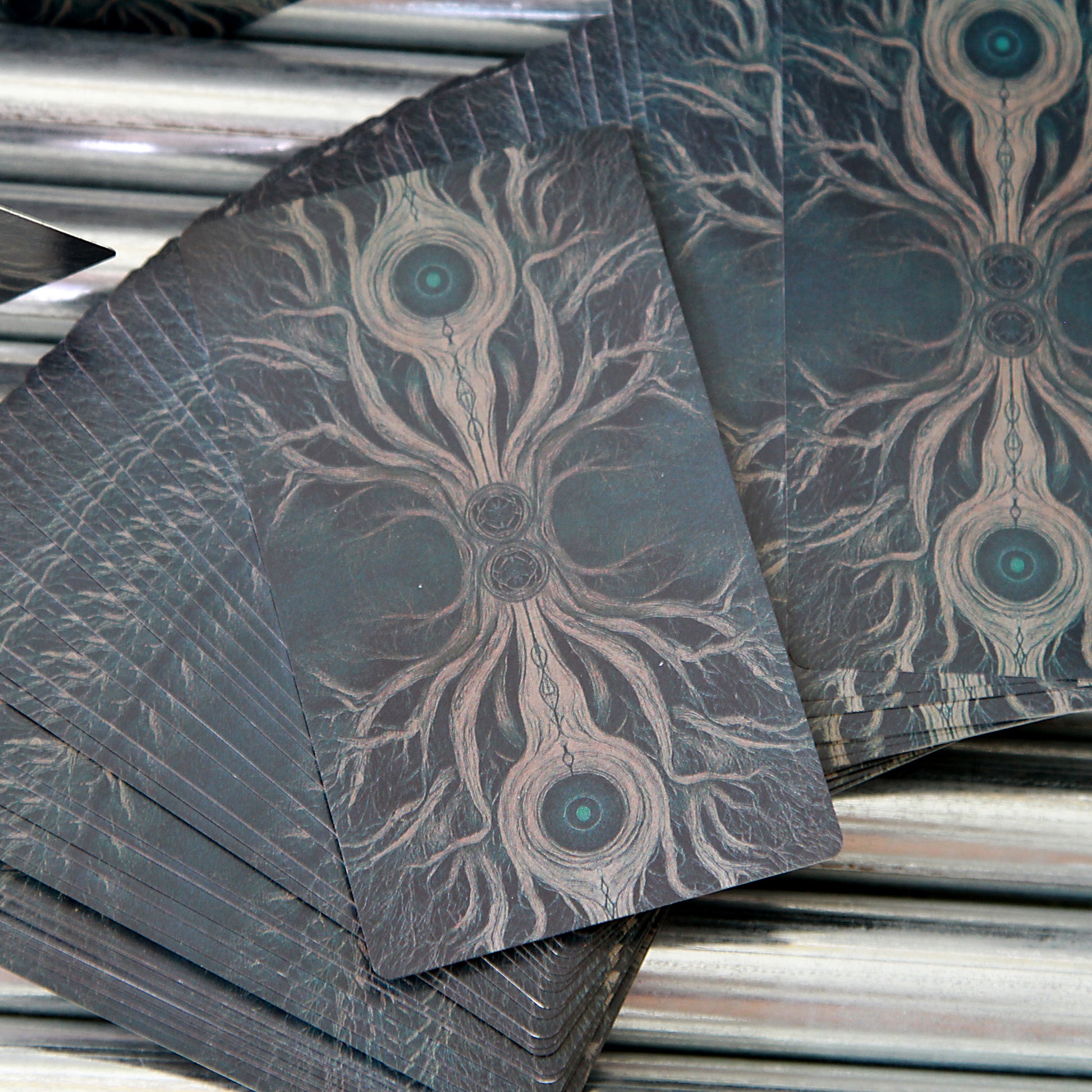 A haunting journey through the realms of dark fantasy, where the grotesque meets the sublime. Inspired by Gothic and surrealist arts, this deck boasts a moody palette and otherworldly motifs – from skeletal jesters and masked figures to barren forests and spectral creatures. Its shadowed aesthetic channels deep emotional truths and the allure of the unknown.