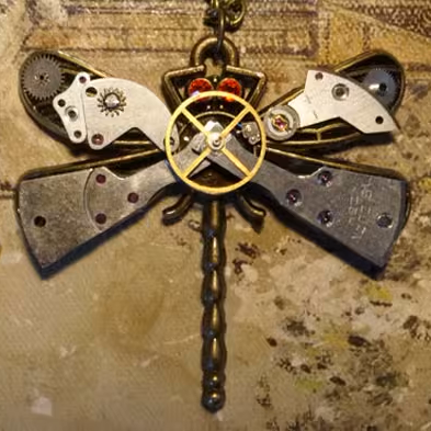 Modeled after a dragonfly-shaped aircraft and forged from timeworn metal, this small marvel takes flight as a relic of a forgotten era. Its wings, crafted from salvaged gears and weathered plates, beat with the quiet precision of lost machinery. Red rhinestones gleam like searchlights or the dragonfly's eyes, scanning the skies for secrets long buried. It stands as a testament to the beauty of rust and rivets, carrying the legacy of the skyborne machines that came before it.