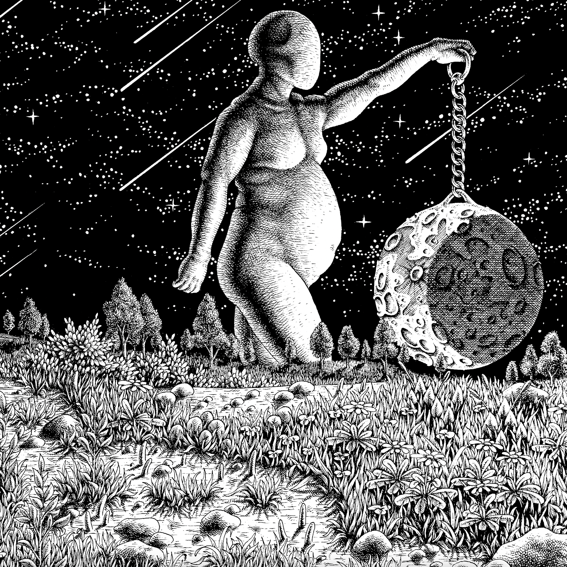 In "Moon Man," Michael Salvadori paints a surreal and an evocative image of a colossal featureless being traversing an alien planet while holding the moon like a mere lantern. Having a sarcastic undertone, the visual narrative invokes themes of isolation and the interplay between the known and the unknown in the cosmos.
