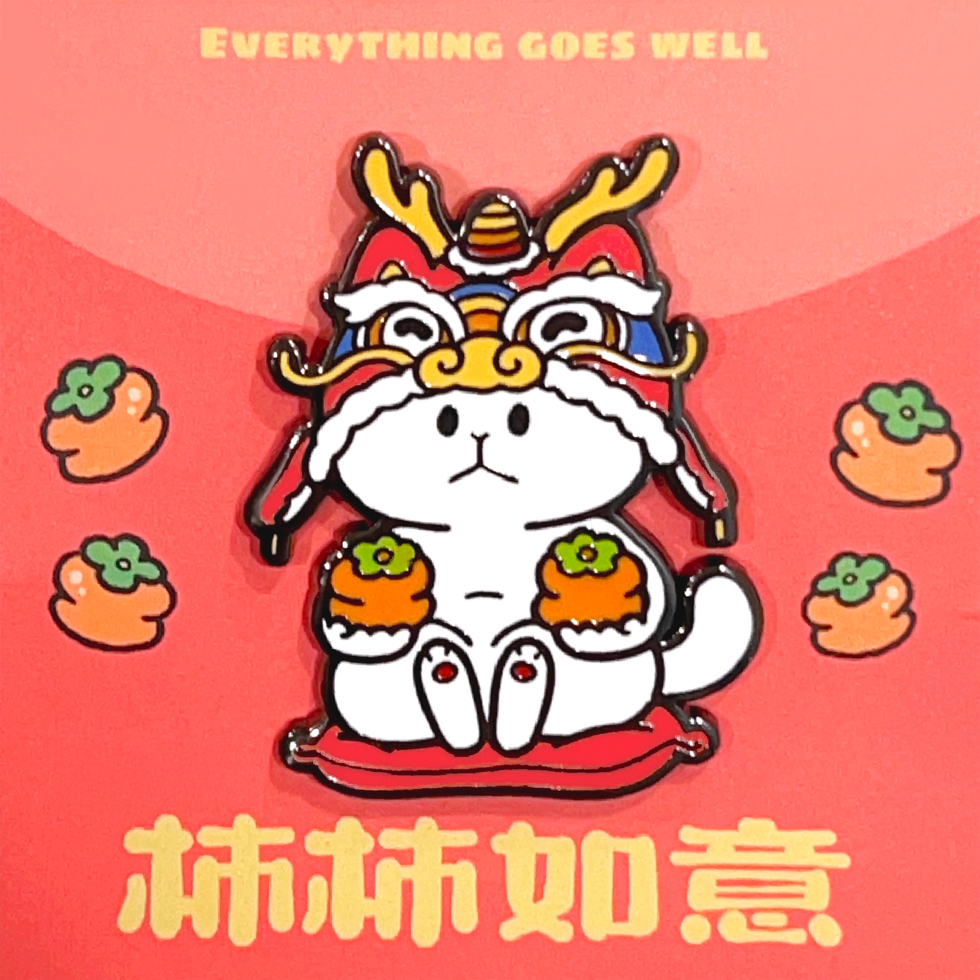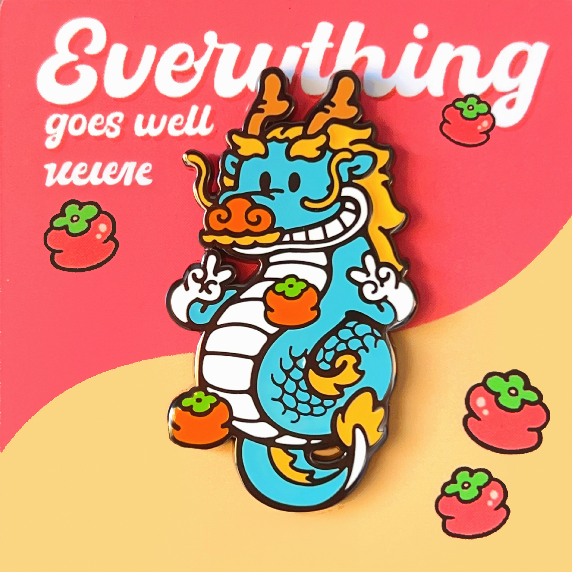These cheerful pins blend tradition with cuteness: a chill dragon flashing peace signs with persimmons on deck, and a lucky cat in a dragon mask holding persimmons. Perfect for Lunar New Year, new beginnings, or anytime you need a little fruity fortune on your side.