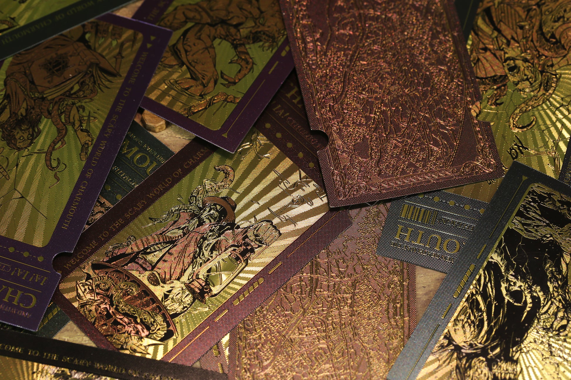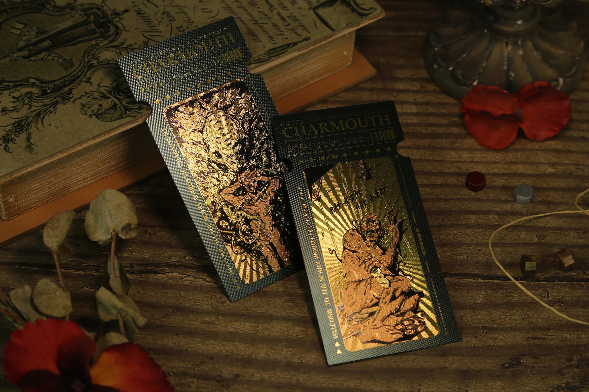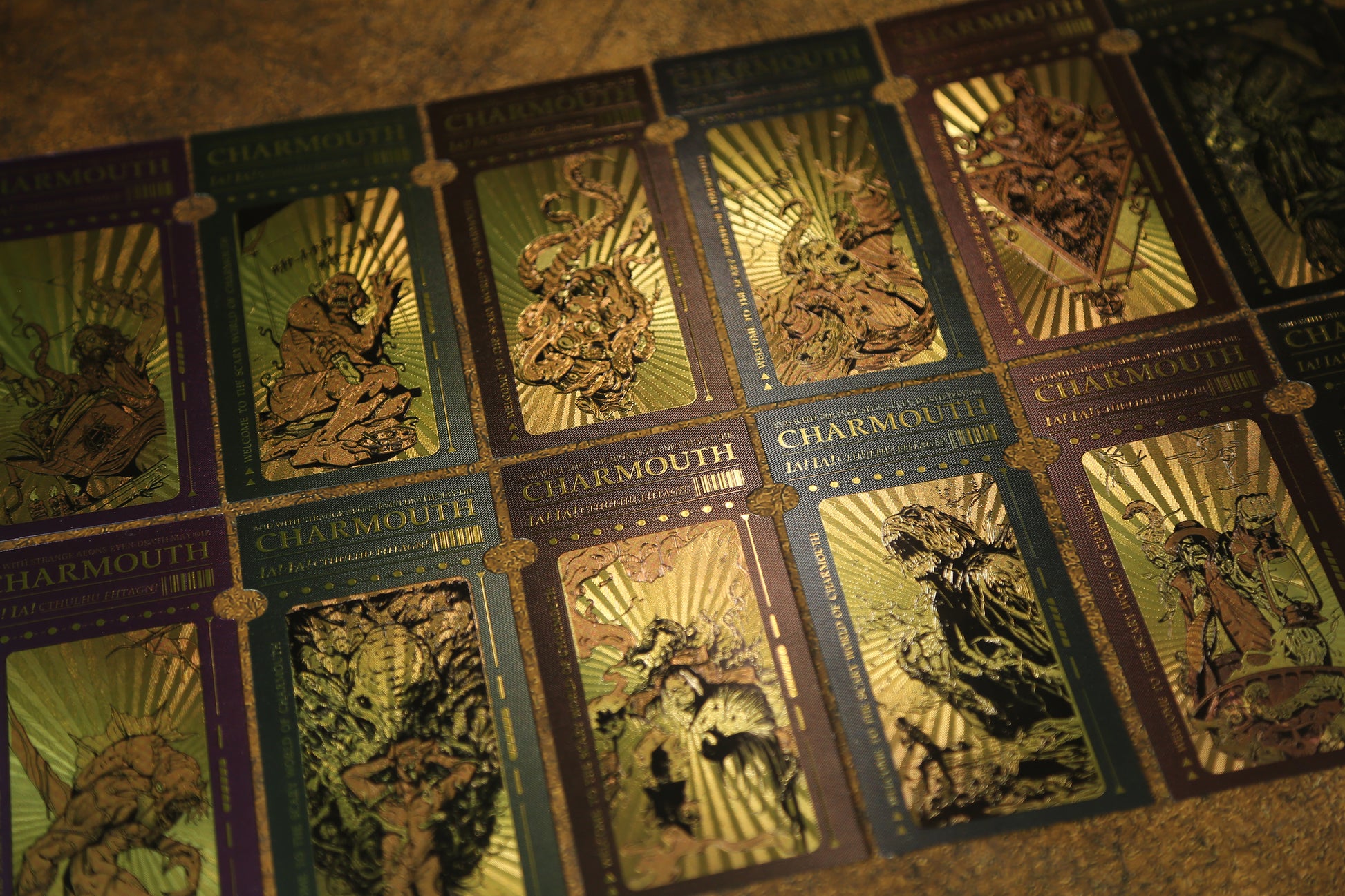 Capturing twelve strange horrors lurking within Charmouth, this set will plunge you into the eerie, twisted Lovecraftian world where strange, ominous creatures reign supreme. Each piece depicts an unsettling scene rich with haunting imagery. The variety of color adds a fantastical touch, blending with a metallic sheen to heighten the grotesquery.