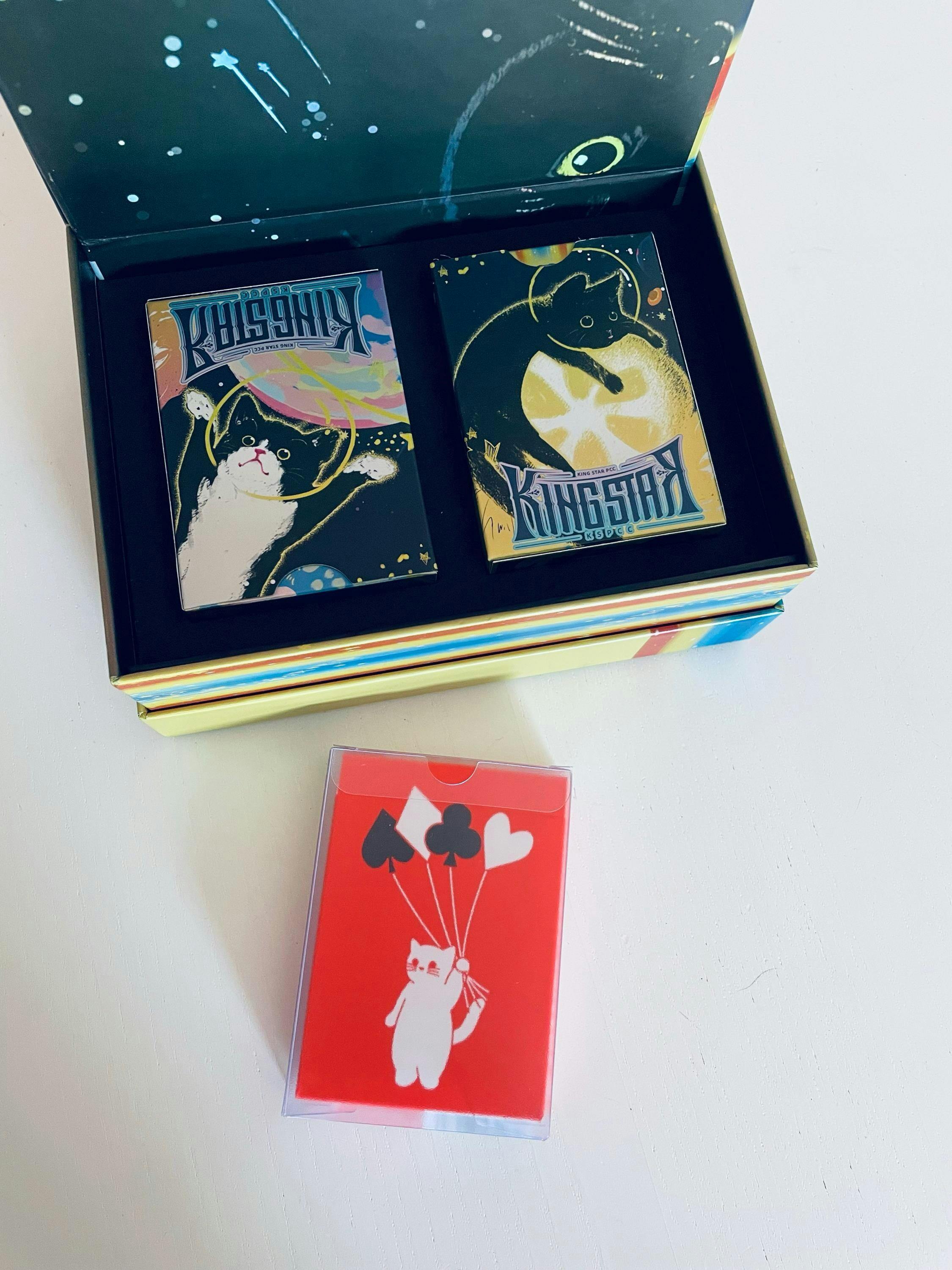 Purrfect for pet-friendly game nights, these decks introduce two adventurous cats who have grown weary of their human-dominated lives and decided to set out for the playful unknown. The artist's affection for cats shines through in the humorous depictions and creative blend of feline elements with traditional poker setup. Designed for cardistry, the edge and back guarantee stunning fan-out effects, while the collector's box boasts a 3D pop-up art that brings the magic to life.