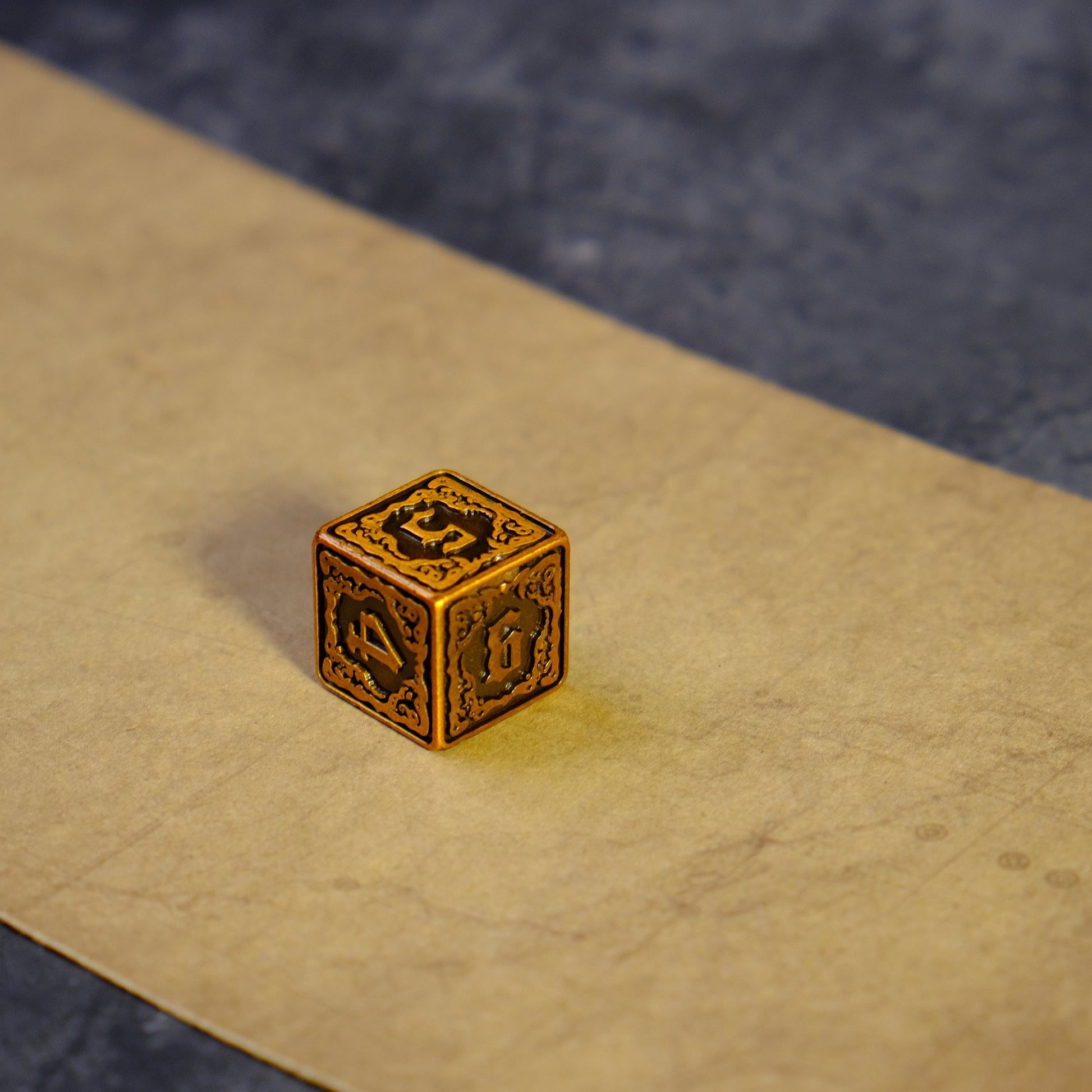 Crafted to conjure the dread of the Lake of Hali and marked by the foreboding touch of the King in Yellow, this unusual D6 radiates a spectral glow, as though it had tasted the light of Aldebaran. Each face is adorned with arcane symbols and shadowed edges, hinting at the madness lurking beneath its golden veneer. In your hand, it feels unnervingly alive, pulsing with a presence that defies comprehension.