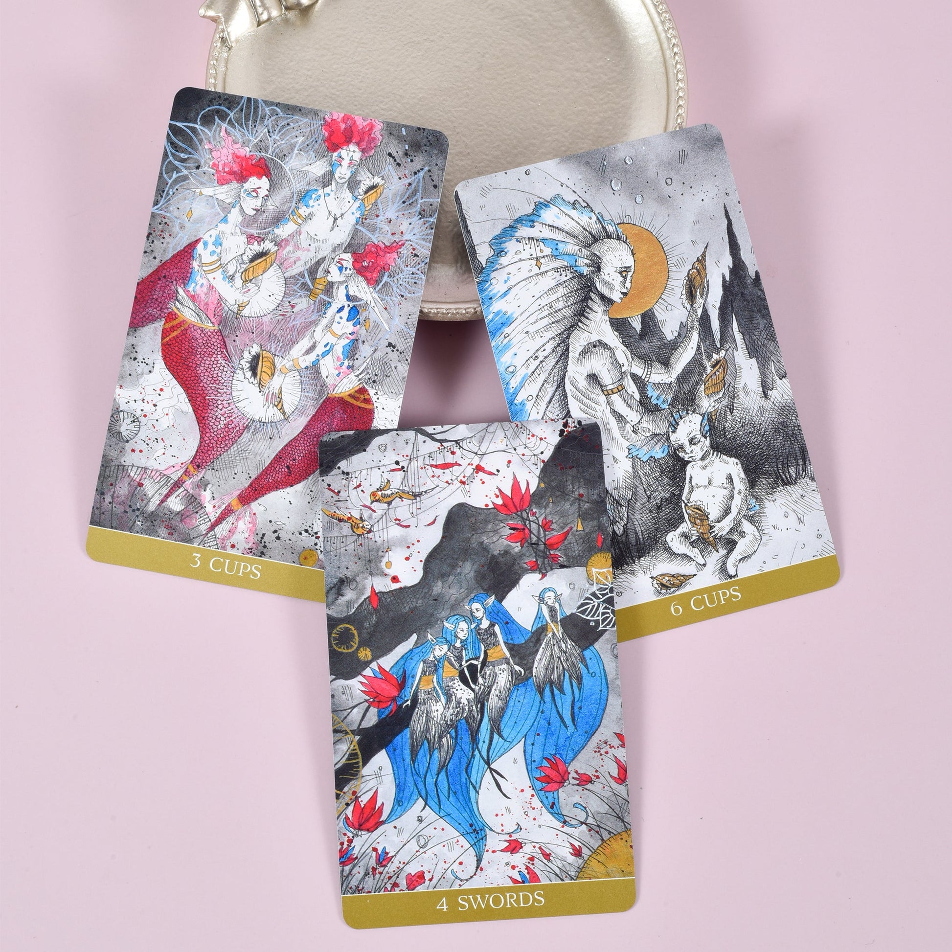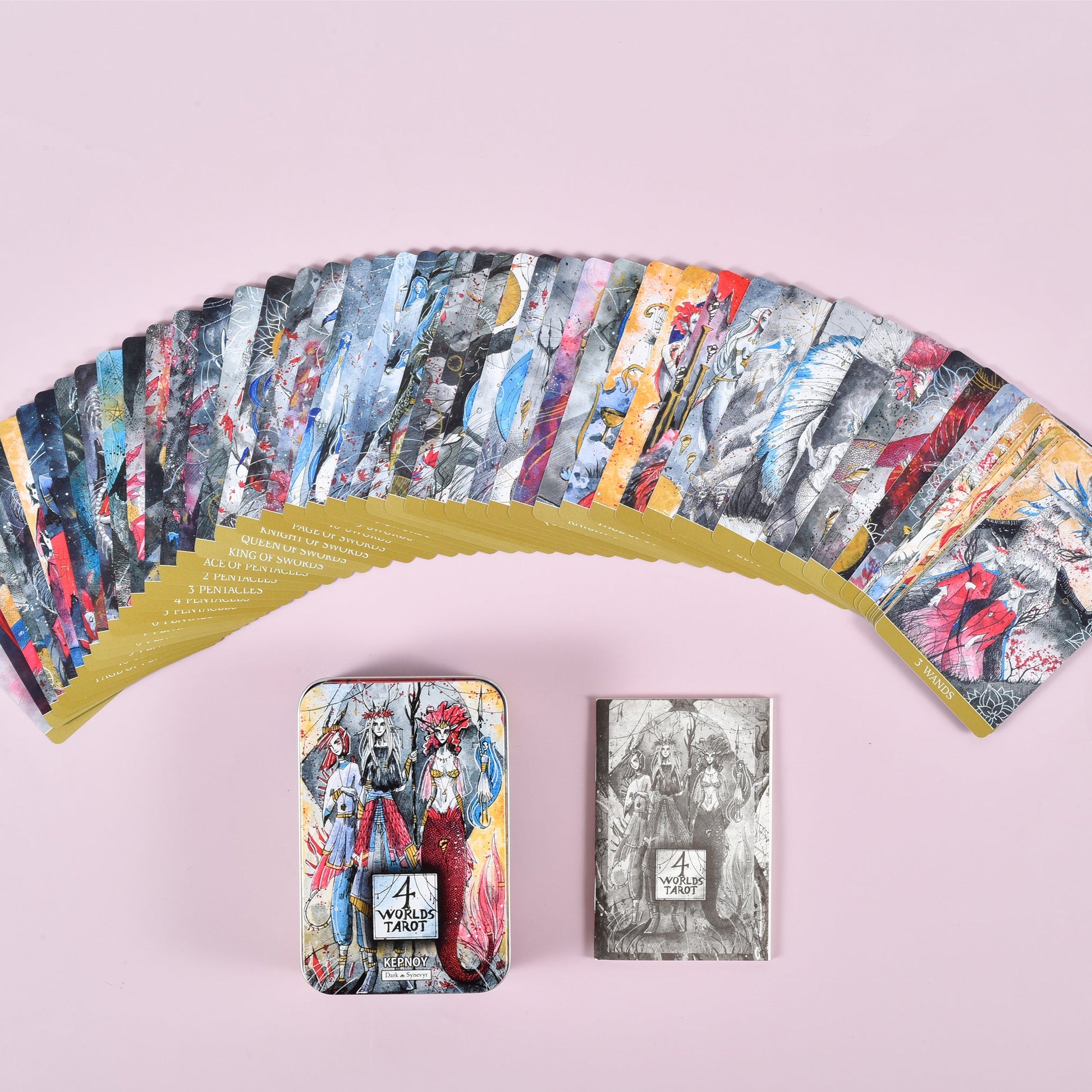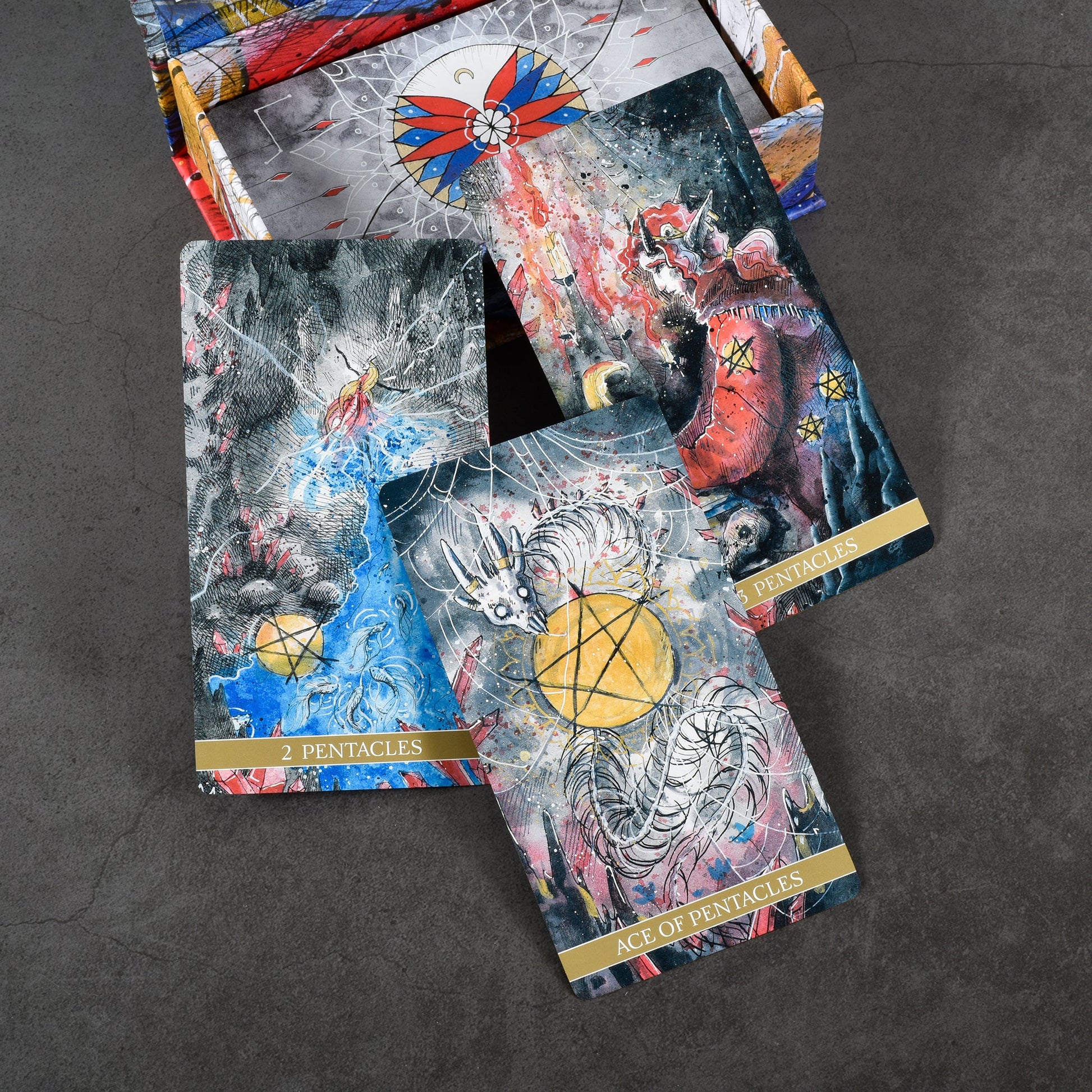 Imbued with primal energy, this wildly imaginative take on the Rider-Waite tells us to face life and death with a light heart, through its uninhibited portrayal of the Four Realms. It channels esoteric philosophy in a riot of color, while the Western comic brushwork lends a playful touch – perhaps even a knowing smile. Amidst chaos, this deck will guide your soul to its place of rest and awaken the power that has always dwelled within.