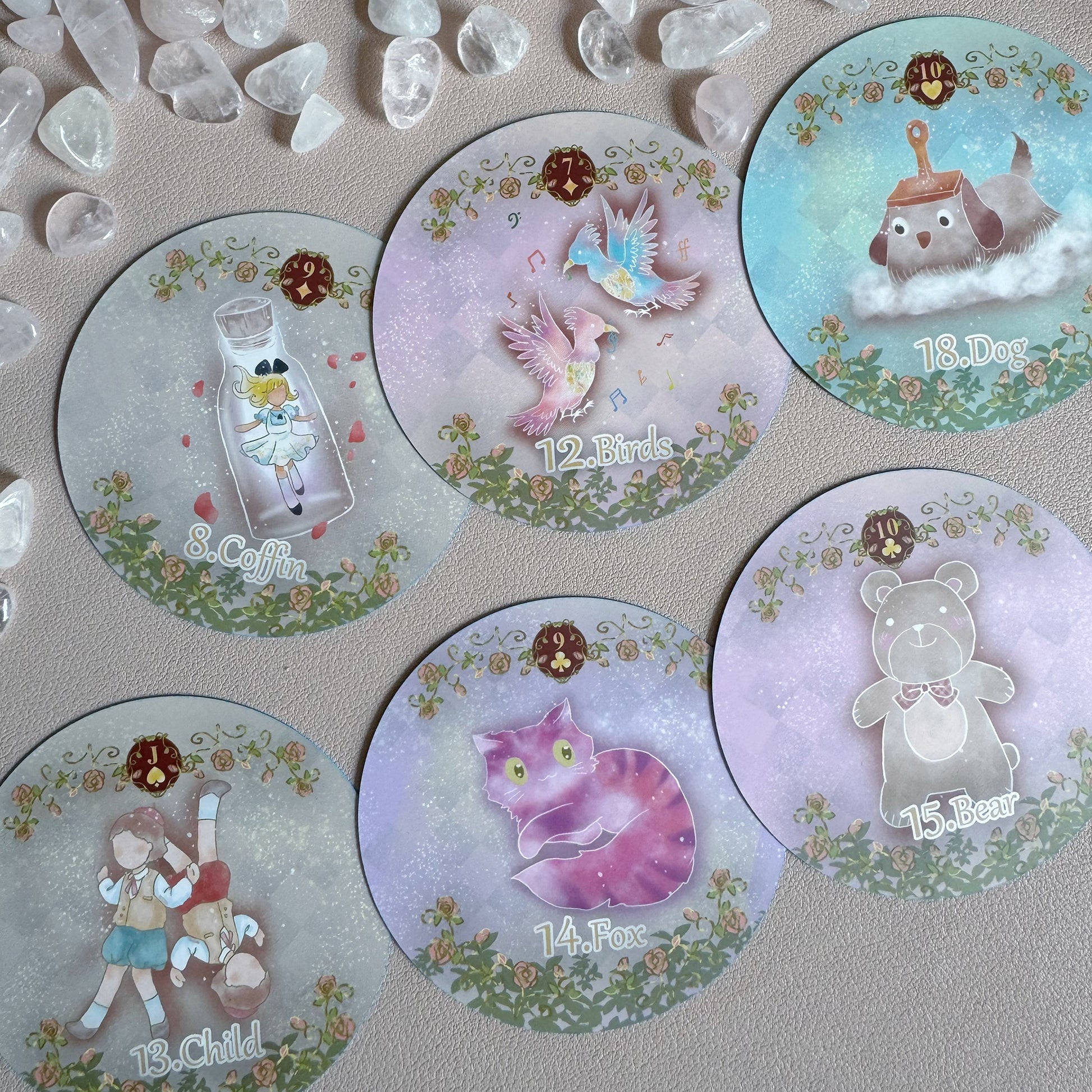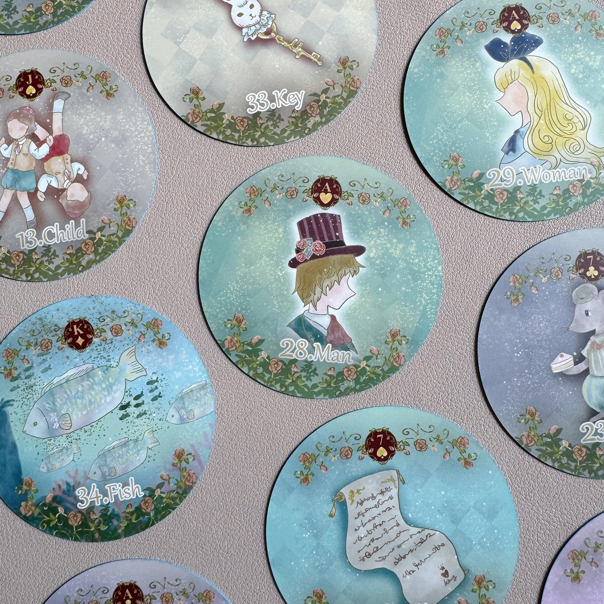Inspired by Alice's Adventures in Wonderland, this 41-card deck exudes a whimsical, childlike charm. Each card captures a scene or character from Alice's tale, creatively blending the magic of Wonderland with the timeless essence of traditional Lenormand. Through this deck, we invite you to embrace Alice's spirit of adventure, which shall guide you on your own heartfelt journey.