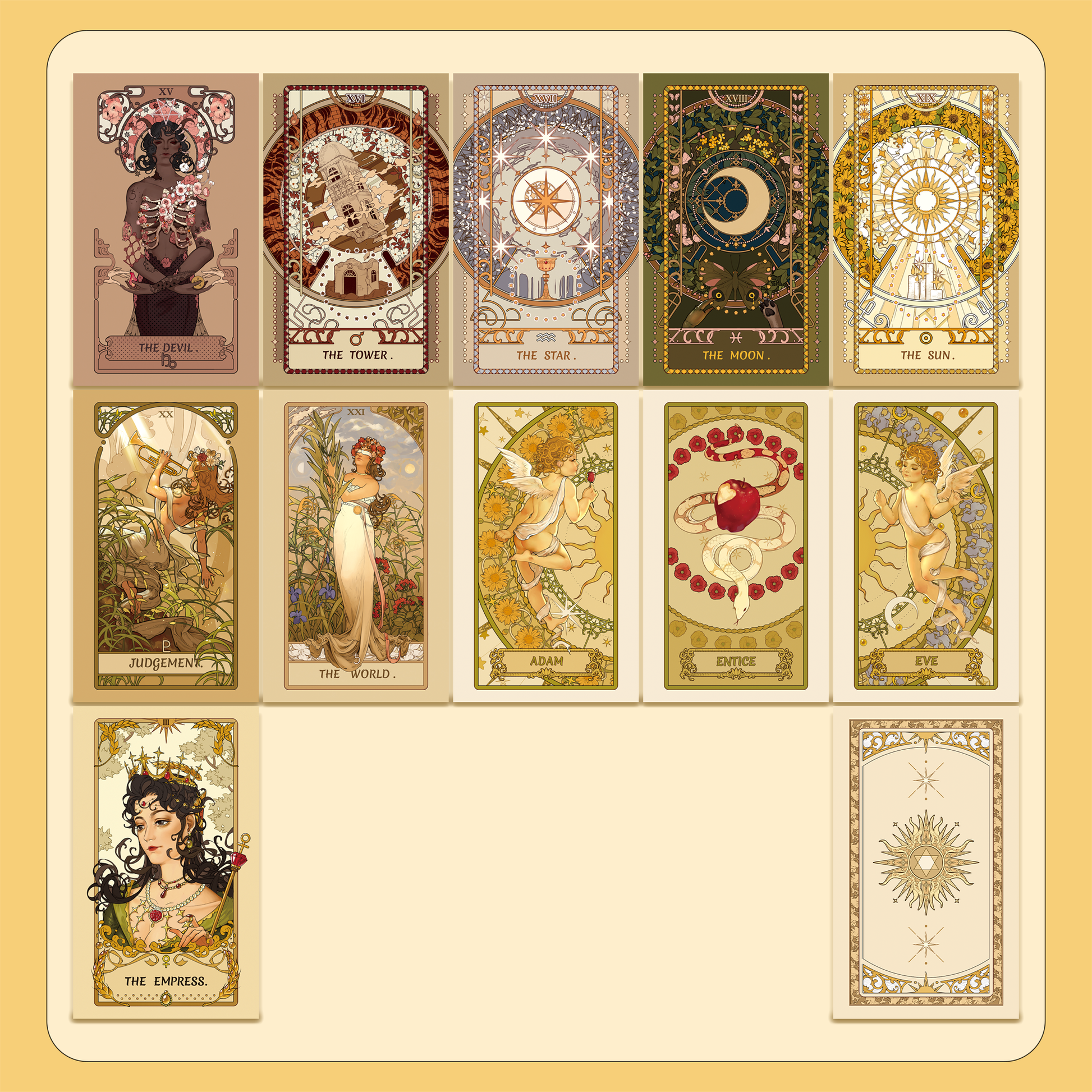 - Includes: 22 Major Arcana + 56 Minor Arcana + 4 bonus cards ("Adam" "Entice" "Eve" & "The Empress" replacement)