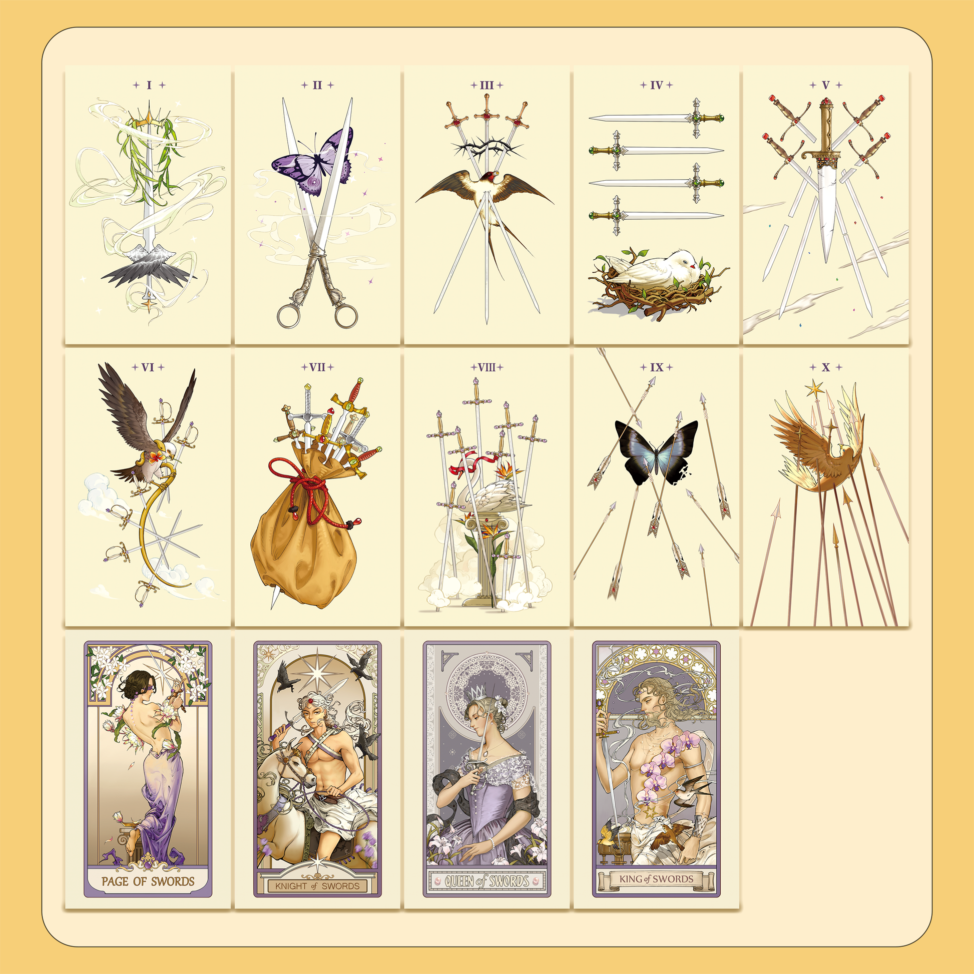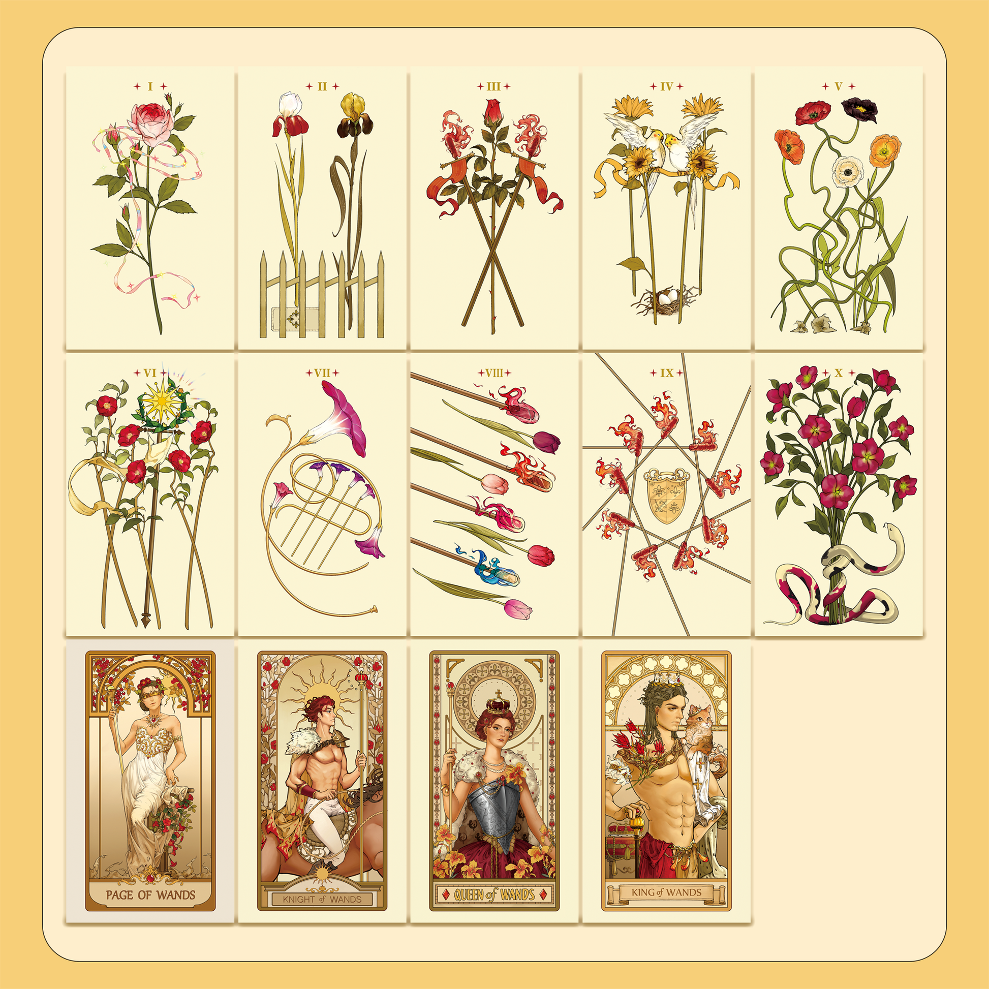 By embracing the vintage opulence of Alphonse Mucha's style, this Rider-Waite deck brings comfort to the eyes and inspiration to the minds. Each drawing is thoughtfully composed to accentuate the figures' poise. To make the art even more sophisticated, the author has added a touch of Rococo style to the background. Finally, each card is enriched with the language of flowers, a fusion that offers refreshment while making the deck both visually unique and deeply meaningful.