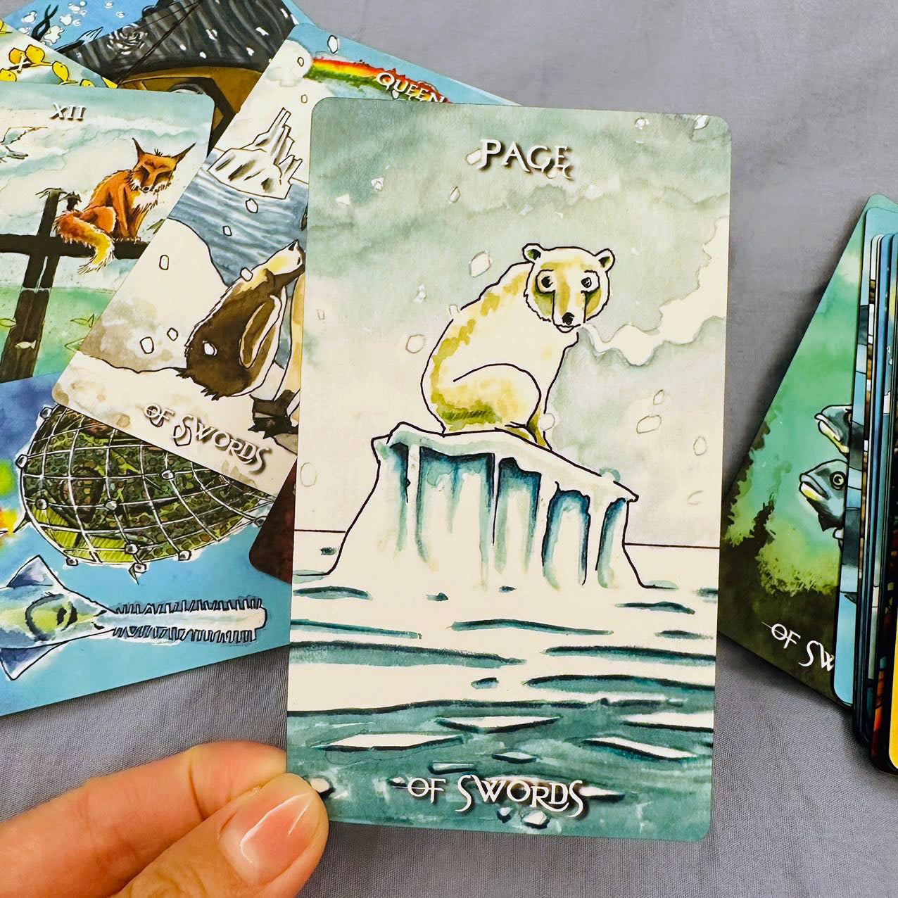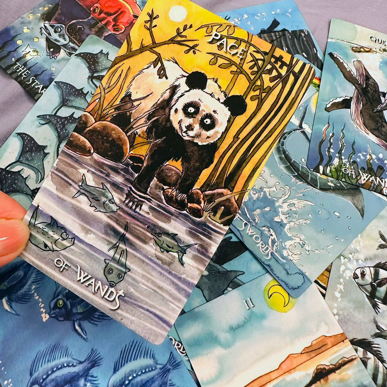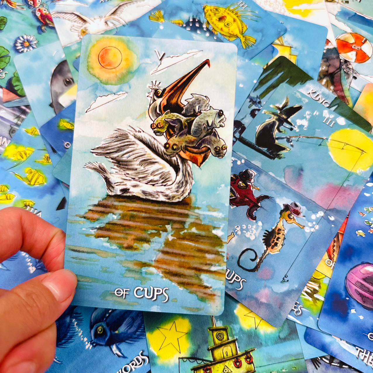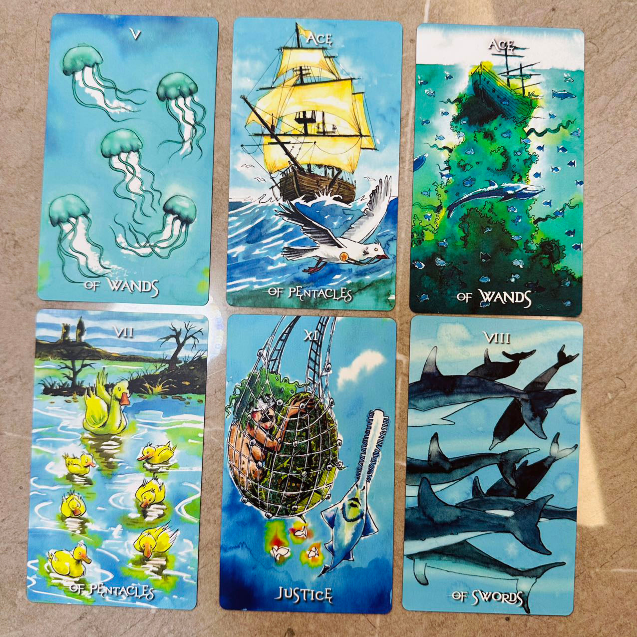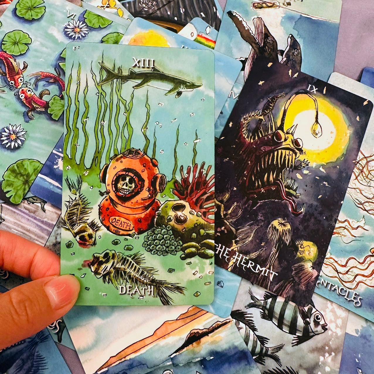 Plunging into an underwater world where mystical creatures and oceanic symbols bring each card to life, this Rider-Waite deck reimagines traditional tarot themes through surreal oceanic landscapes with a colorful, whimsical style that invites exploration. A total of 78 aquatic illustrations, from whales and turtles to lighthouses and divers, merge the mysterious and magical. The artwork captures both the serene and turbulent aspects of the sea, creating a unique tarot experience that resonates with both novice and seasoned readers.